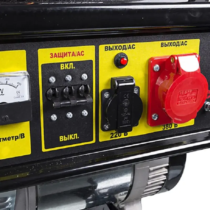 Для подключения потребителя генератор оснащен розетками на 220 Вольт и 380 Вольт. Генератор оснащен также выходом постоянного тока с напряжением 12 Вольт для подзарядки аккумуляторных батарей. Важно: аккумулятор не входит в комплект поставки, он приобретается отдельно.