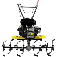 Бензиновый мотоблок приводится в действие четырехтактным одноцилиндровым двигателем объемом 208 см3 с воздушным охлаждением. Алюминиевый корпус защищает шестеренчато-цепной редуктор от повреждений при работе с тяжелым и каменистым грунтом. Бензобак на 3,6 л и экономичный мотор увеличивают время автономной работы без дозаправки. Система защиты с датчиком уровня масла продлевает срок службы двигателя.