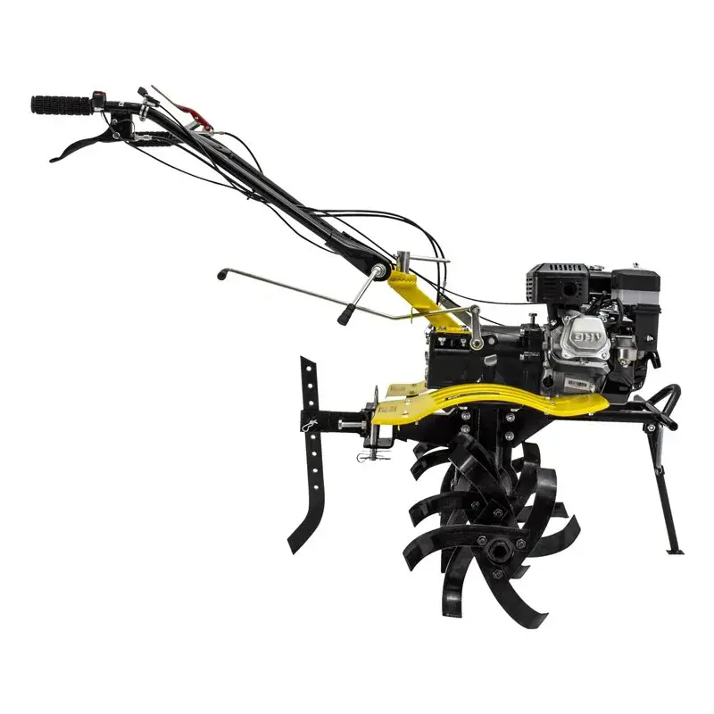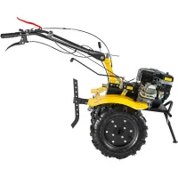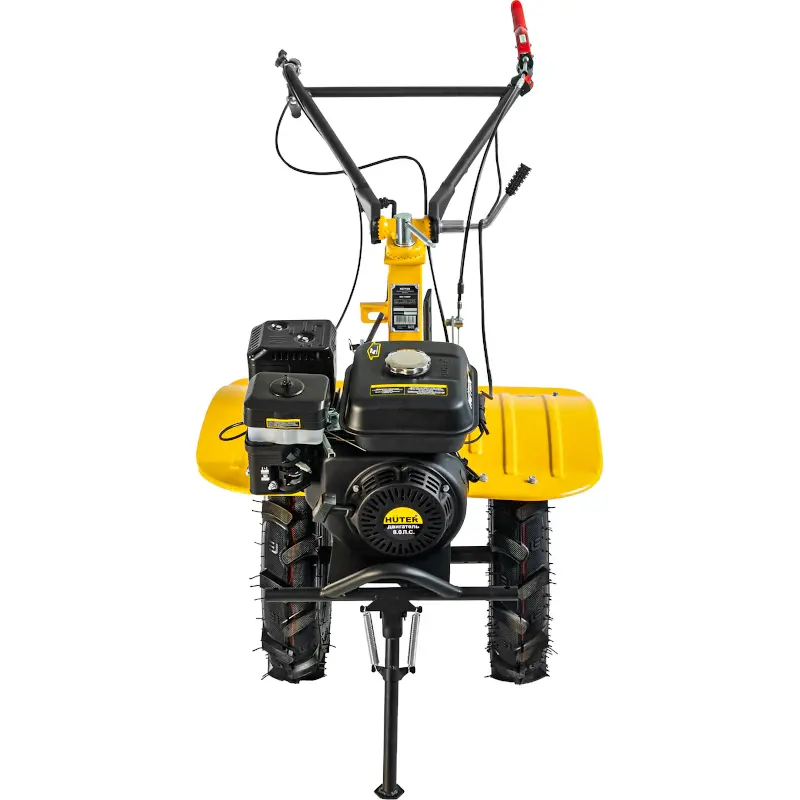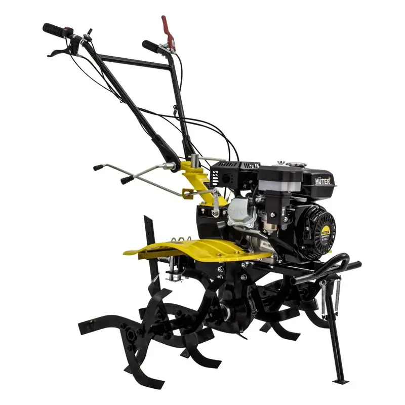 Хорошую проходимость и манёвренность HUTER МК-1008Р обеспечивает наличие трех передач – две вперёд и одна назад, а также широкие резиновые колёса 4х10 с глубоким, агрессивным протектором. Всё это позволяет мотокультиватору уверенно продвигаться по влажной земле и рыхлому грунту. Машина имеет удобную систему управления с переключателями на ручках агрегата. Защита пользователя обеспечена специальным щитком.