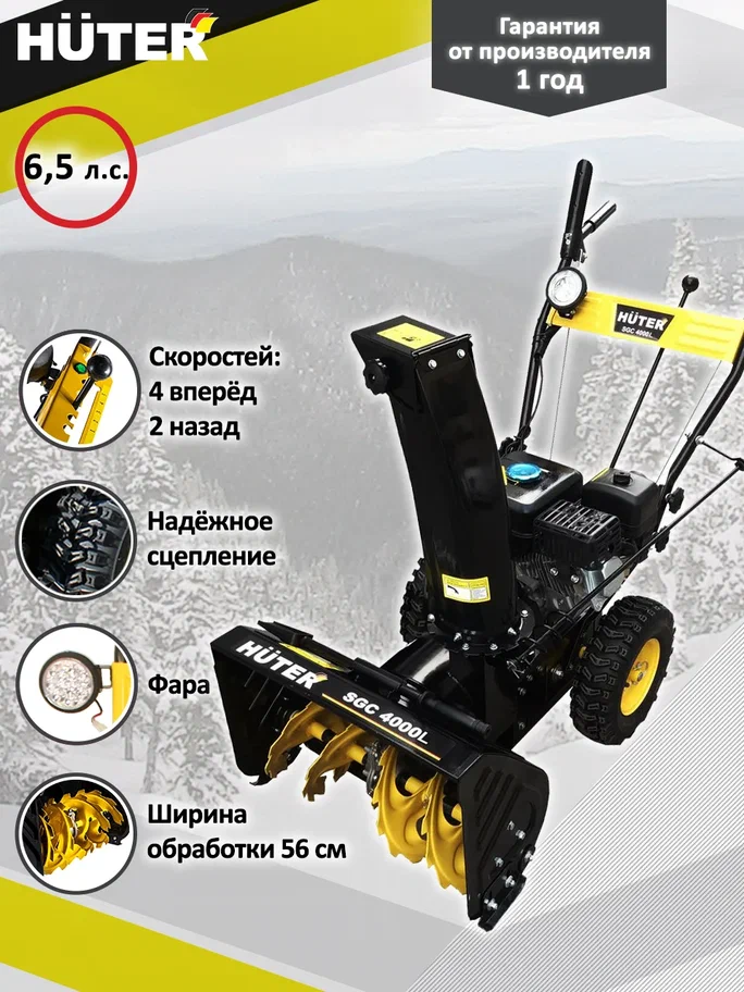 Снегоуборщик бензиновый Huter SGC 4000L оснащен двигателем мощностью 6,5 л.с. и ковшом с шириной захвата 56 см. За счет этого можно убирать просторные территории даже с сугробами.