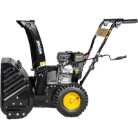 Рычаги привода колес и шнека удобно расположены на рукоятках. Разгрузочный желоб можно поворачивать на 180° при помощи длинной ручки, не отходя от места оператора. Дальность выброса легко регулируется посредством изменения положения дефлектора при помощи барашковых винтов.