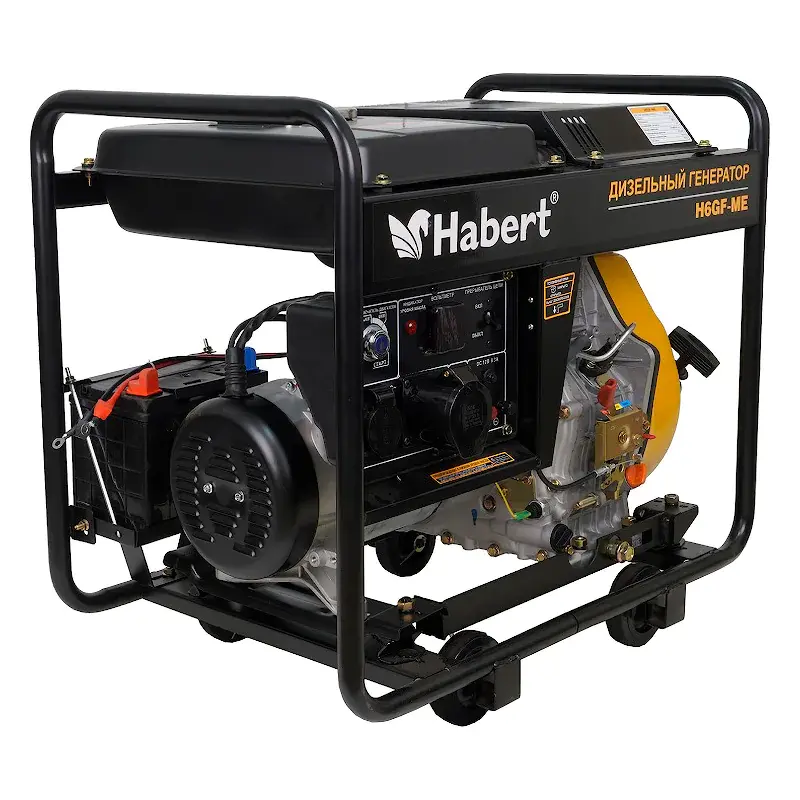 Дизельный генератор Habert Diesel H6GF-ME — это подвижная энергетическая установка с приводом от двигателя внутреннего сгорания. Максимальная выходная электрическая мощность переменного однофазного тока напряжением 220 В частотой 50 Гц составляет 6 кВт. Передвижная электростанция используется в качестве резервного источника питания в частном доме, на даче, в кемпинге, может служить главным источником питания объектов уличной торговли или малого строительства.