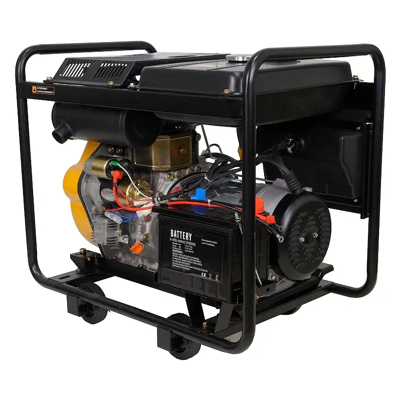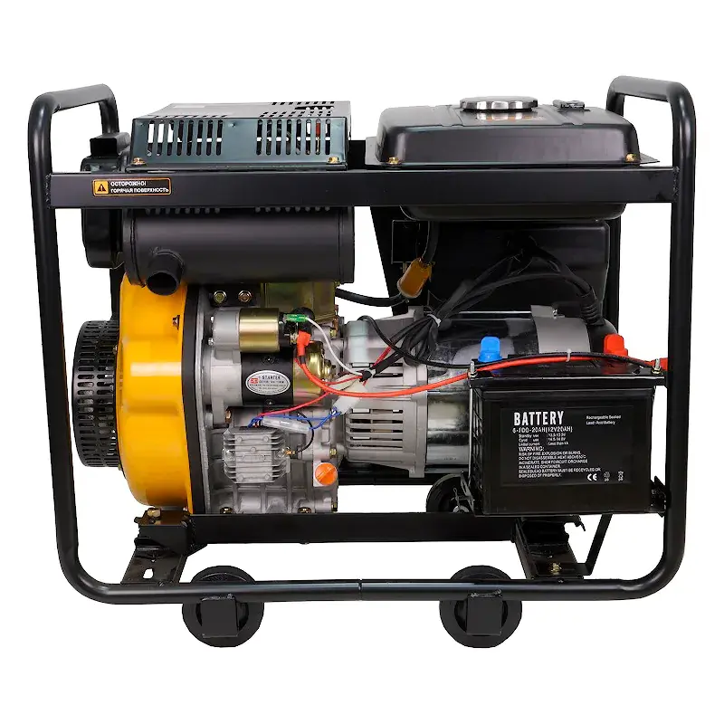 Клемма заземления защищает вас от удара током. В аварийной ситуации срабатывает устройство автоматической остановки, предотвращая поломку двигателя. Дизель генератор имеет открытую рамную конструкцию. Для удобства перемещения предусмотрены четыре колеса и две ручки.