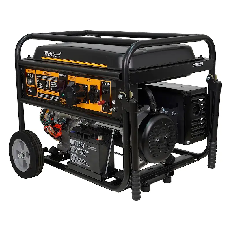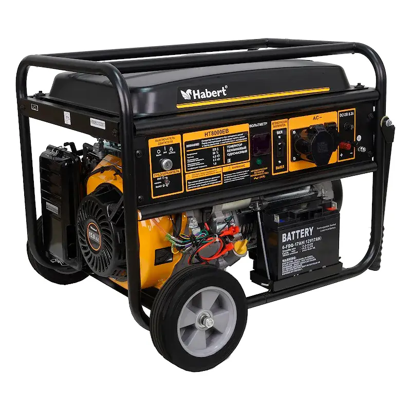 Бензиновый генератор Habert HT8000EB — компактная передвижная электростанция с максимальной выходной мощностью 6,5 кВт. Данная модель силовой техники снабжена двумя розетками 220 В с защитой от влаги и пыли и одной 12 В, обеспечивает надежное энергоснабжение во время отдыха на природе, на рыбалке, а также при аварийном отключении электроэнергии на даче, в частном доме, гараже, мастерской.