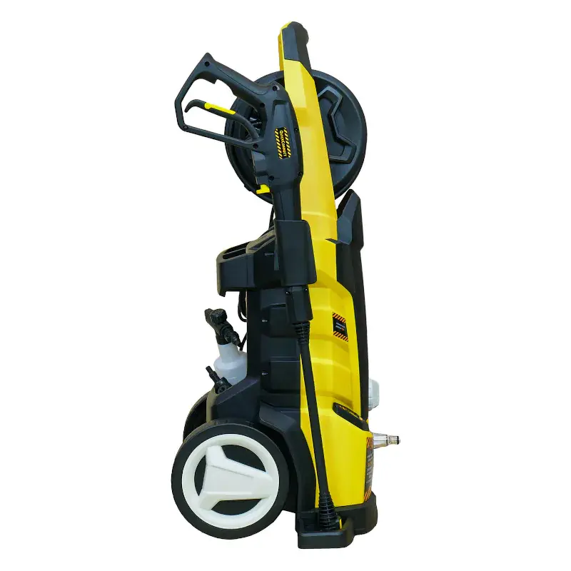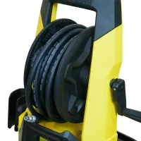 Педаль опрокидывания позволяет одним движением привести мойку в транспортировочное состояние. При этом вес аппарата переносится на колеса, поэтому вам будет удобно перемещать его по рабочей площадке. Электрический кабель длиной 5 м, а также 10-метровый шланг позволяют работать на территории площадью до 707 м2. Это удобно, так как вам не придется часто передвигать мойку в процессе уборки.