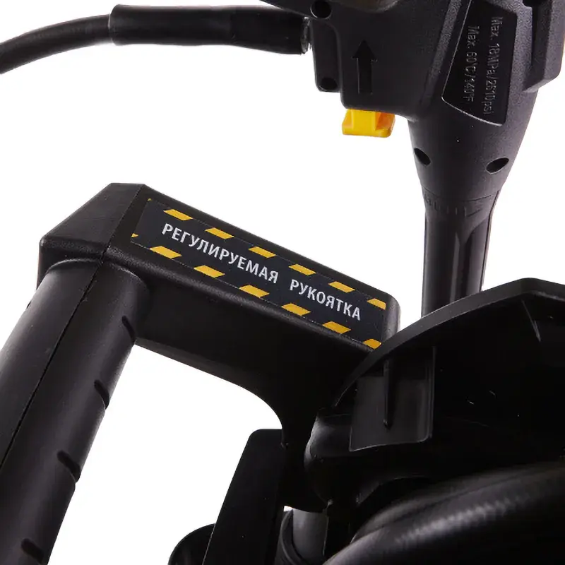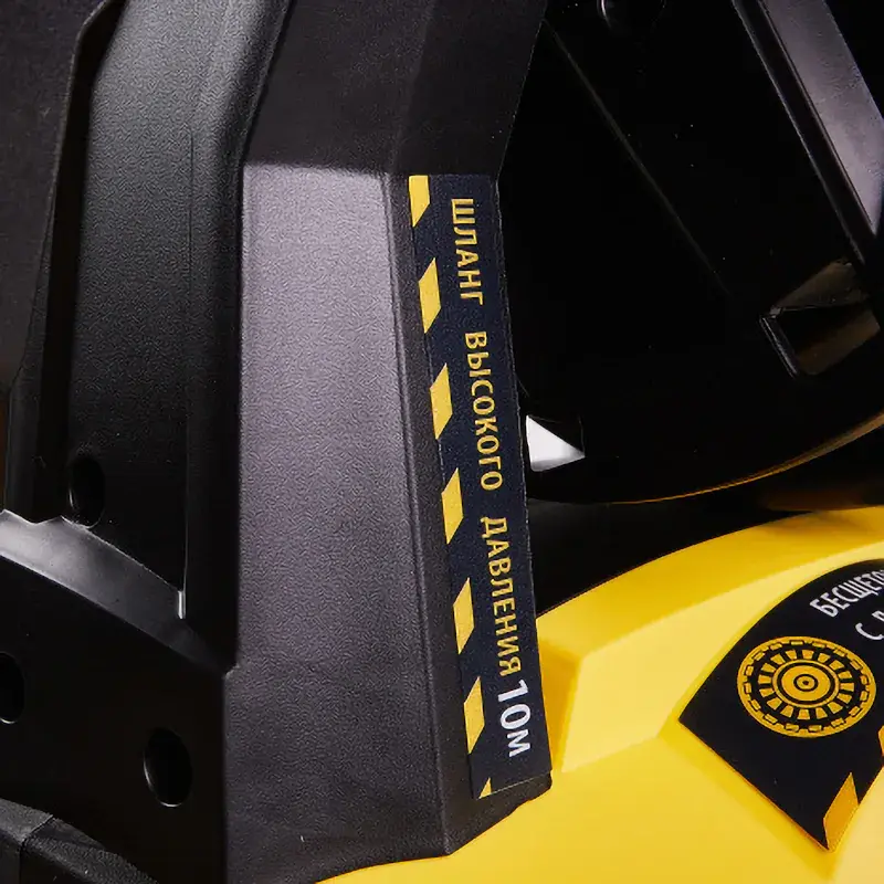Длина электрического провода для питания мойки составляет 5 м, а шланга — 10 м. Вы сможете работать на большом расстоянии от мойки, не перетаскивая часто ее за собой. Для упрощения перемещения аппарата предусмотрены транспортировочные колеса.