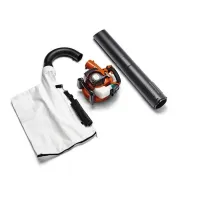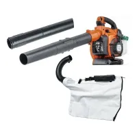 Двигатель аппарата - бензиновый 2-тактный, мощностью 800 Вт. Это обеспечивает исходящий поток скоростью до 76 м/с. Помимо выдувания воздуха, устройство способно работать в режиме пылесоса. Доступны 2 режима сбора мусора - с измельчением и без. Все отходы поступают в съемный текстильный мусоросборник вместимостью 65 л, который поставляется в комплекте.