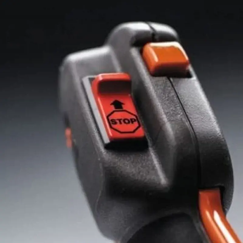Триммер имеет специальную кнопку, расположенную на рукоятке, которая возвращается в положение для пуска автоматически.