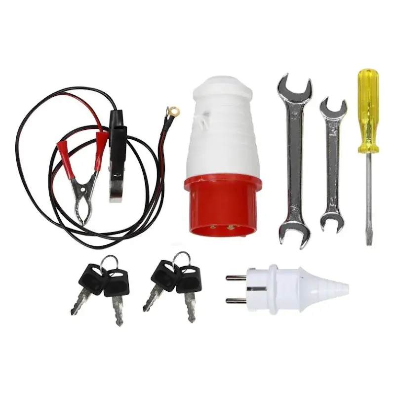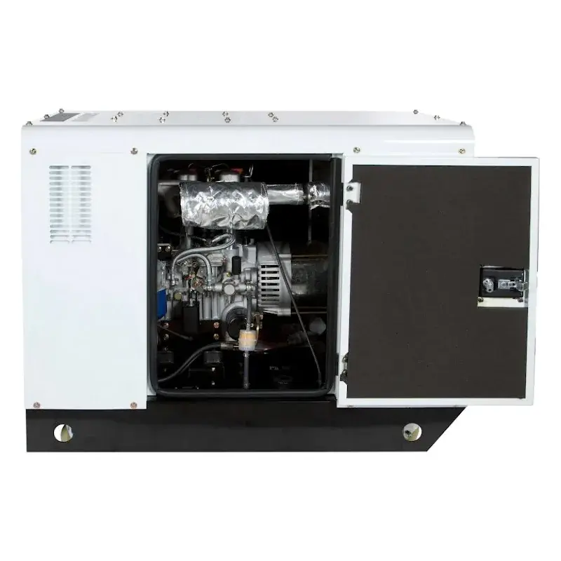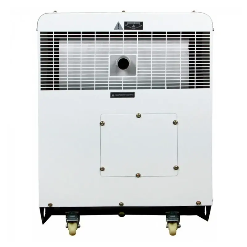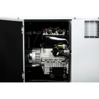 В конструкции предусмотрены 4 транспортировочных колеса, которые облегчают перемещение электрической установки. Закрытый корпус защищает детали генератора от грязи, влаги и механических повреждений. Он также предохраняет от нежелательного проникновения – чтобы открыть металлическую дверцу, ведущую к внутренним элементам, потребуется ключ.