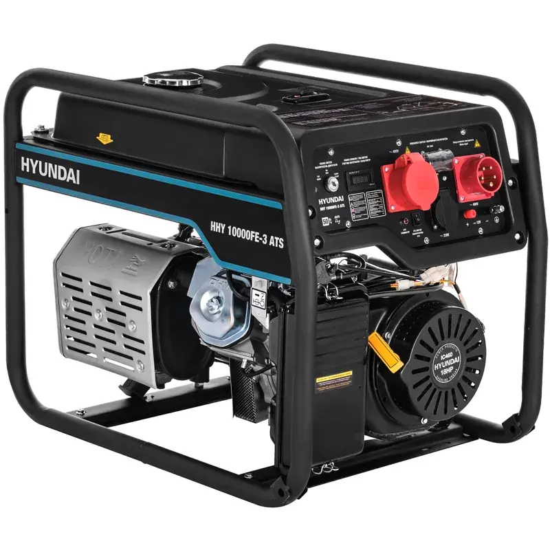 Бензогенератор Hyundai HHY 10000FE-3 ATS оснащен однофазной розеткой на 230 В для питания бытовых приборов и инструментов, и выходом на 400 В для трехфазных потребителей. Клеммы на 12 В с максимальным током 8,3 А дают возможность заряжать аккумуляторную батарею.