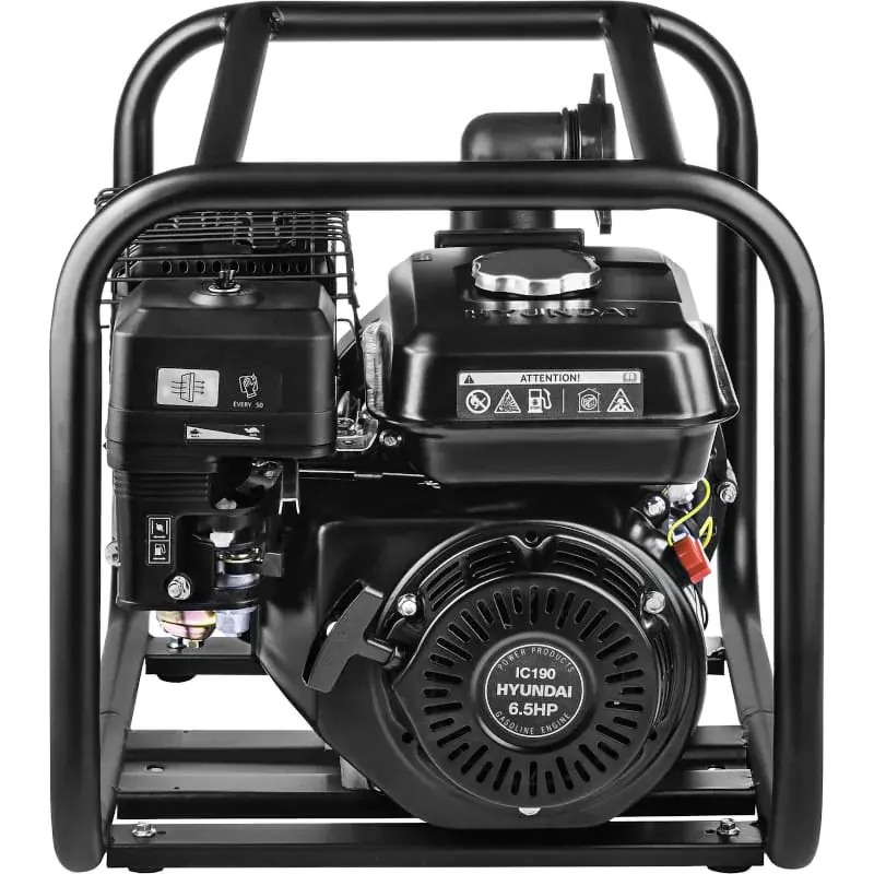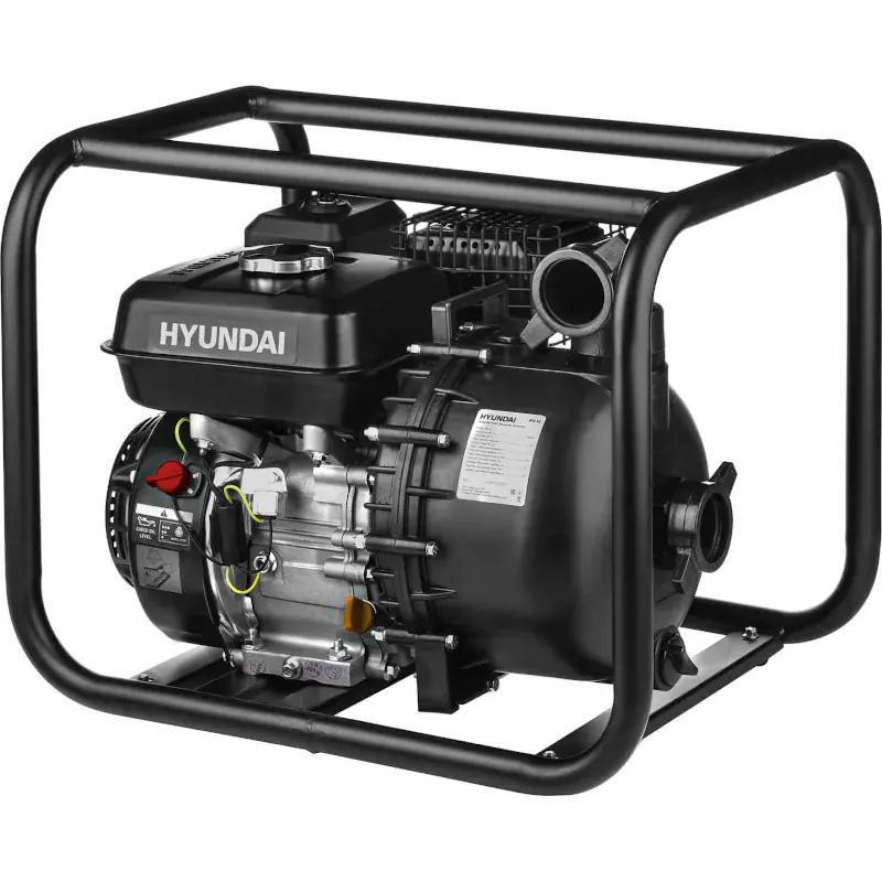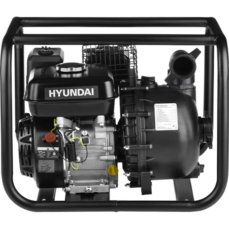 Корпус мотопомпы HYUNDAI HYA 53 сделан из армированного технополимера. Такой материал не подвергается окислению, устойчив к абразивному износу. Двигатель и насос защищены прочной стальной рамой. Она предотвращает поломку аппарата при транспортировке. Низ рамы служит устойчивым основанием, а верхняя часть образует рукоятки для переноски.