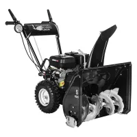 Направление желоба выброса настраивается вручную. Для этого рядом с двигателем расположена ручка. Это удобно т.к. позволяет сохранять расчищенные дорожки в ухоженном виде. Вся убранная снежная масса выбрасывается вбок на расстояние до 11 м.