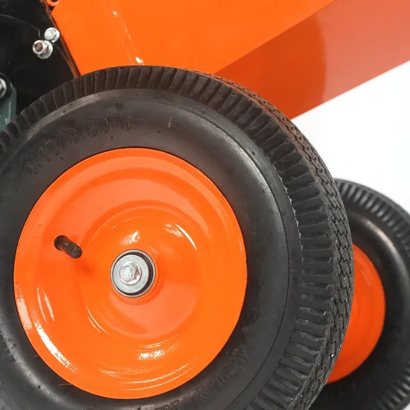 Для экстренного прекращения работы предусмотрена кнопка аварийной остановки. С помощью крышки разгрузочного желоба вы можете регулировать направление и дальность выброса опилок. Два больших колеса и транспортировочная рукоятка позволяют перевозить аппарат по участку. Простой доступ к свече и воздушному фильтру облегчает техническое обслуживание измельчителя.
