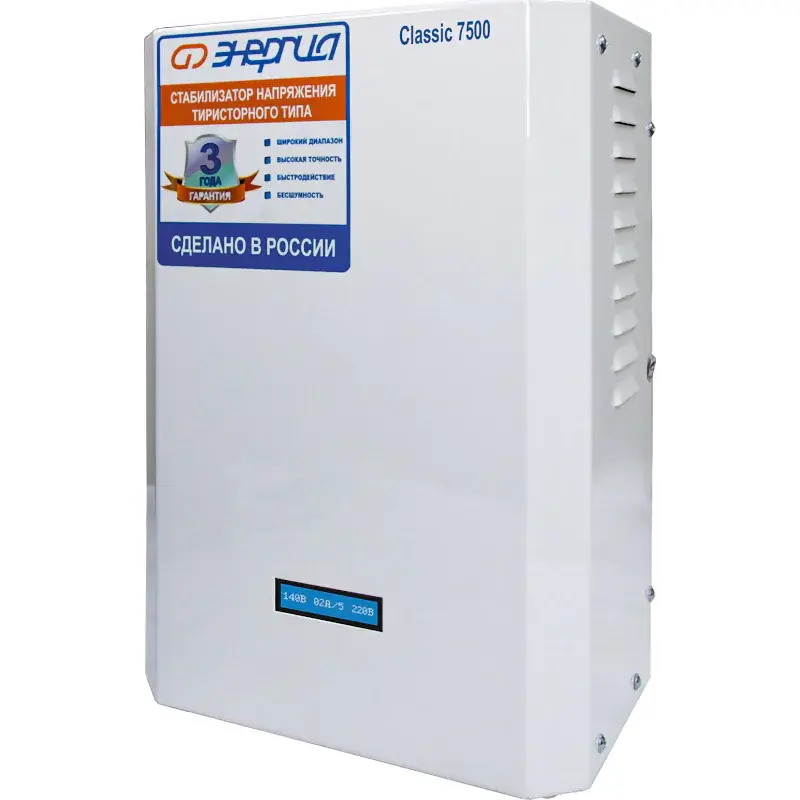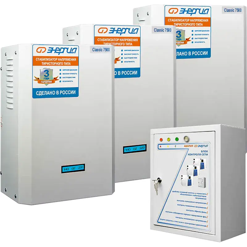 Комплект тиристорных стабилизаторов напряжения Энергия серии Classic 7500 предназначены для обеспечения стабилизированным питанием трехфазных потребителей.