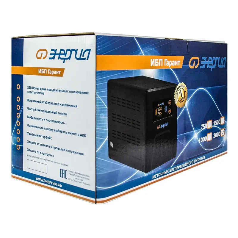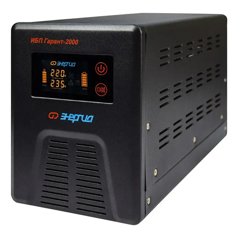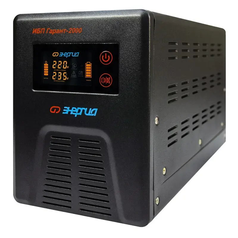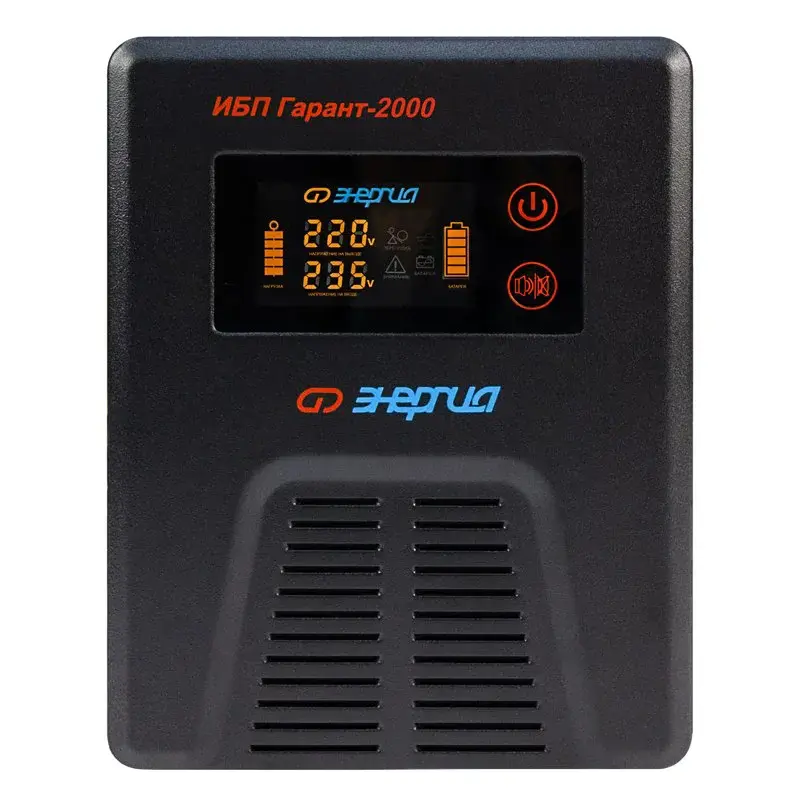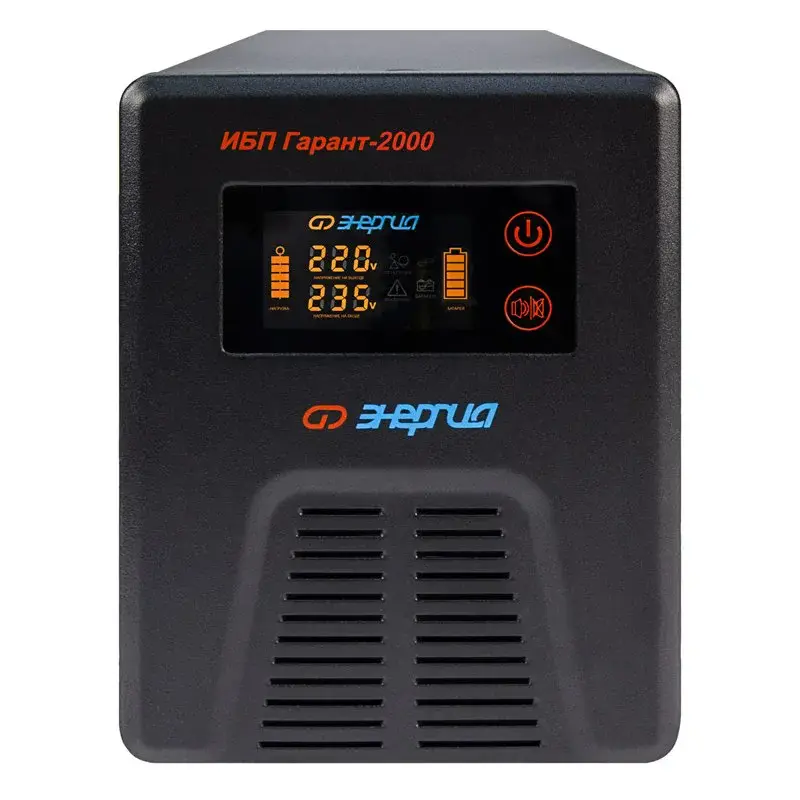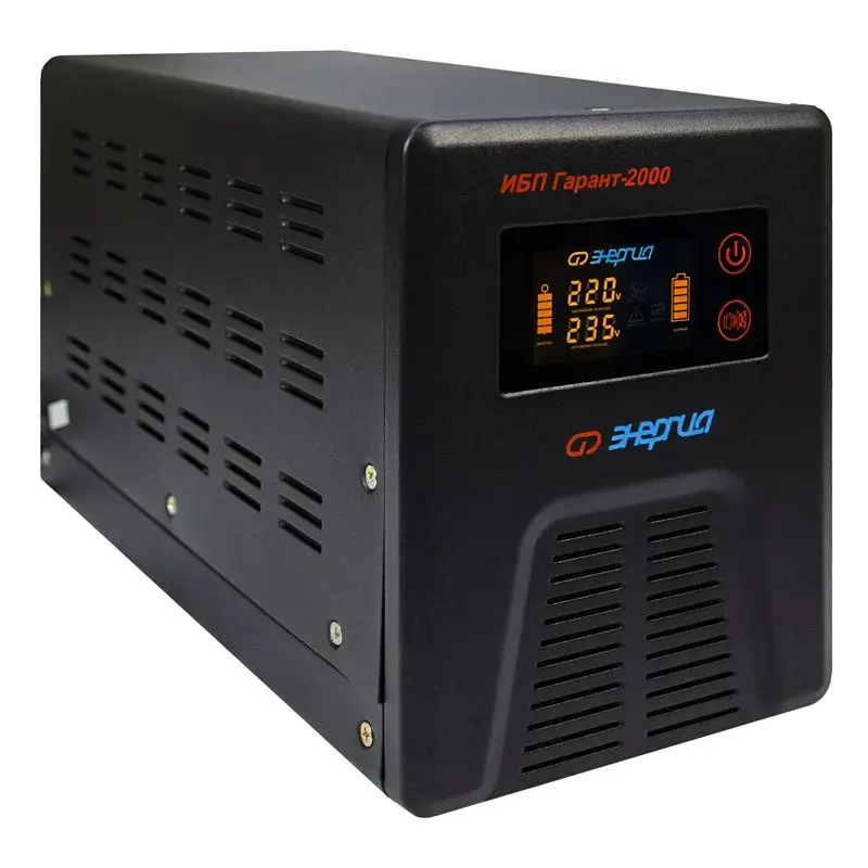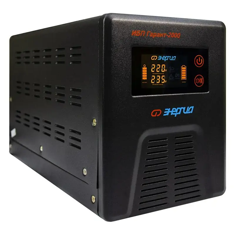 Инверторы «Энергия» серии ИБП Гарант заряжают аккумулятор в момент присутствия сети. При полном пропадании питания прибор находится в режиме преобразователя постоянного сигнала в переменный (инверторный режим). Он преобразует постоянное напряжение аккумуляторной батареи в переменное напряжение 220 Вольт, которое подается к потребителям.