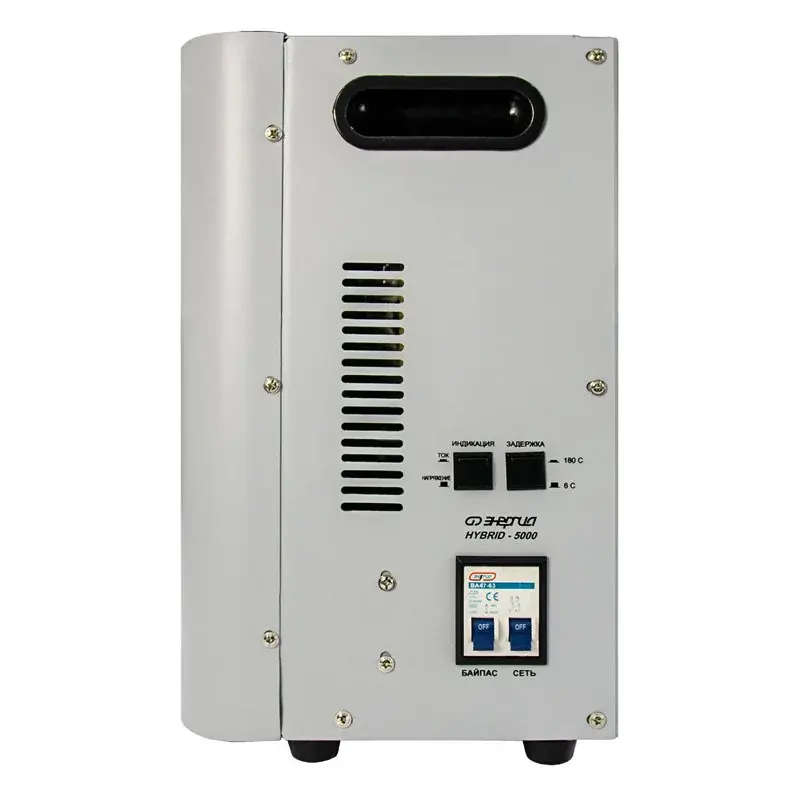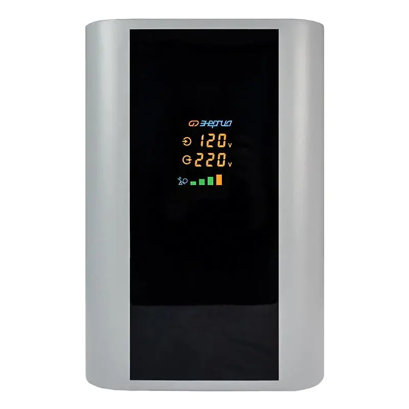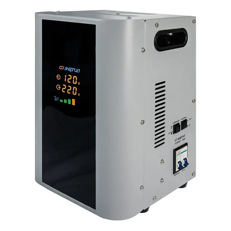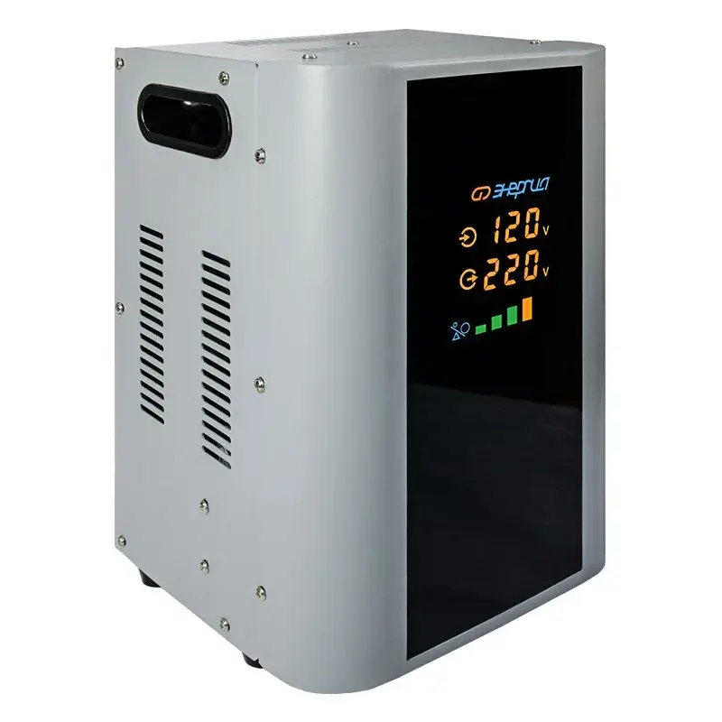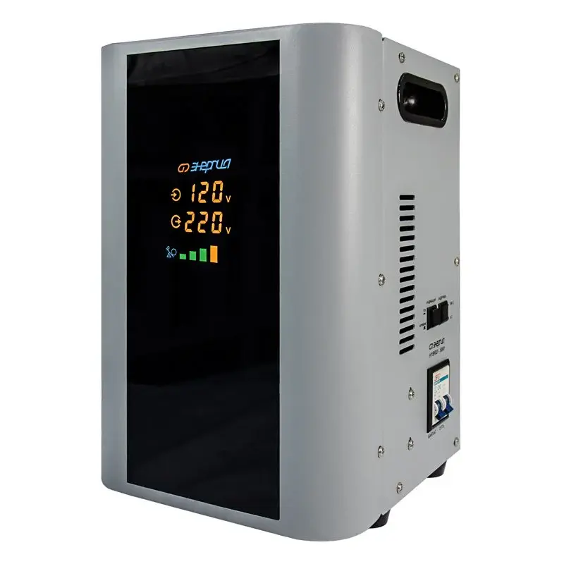 Принцип работы – комбинированный сервоприводно-релейный – в зависимости от напряжения сети. В диапазоне 105-144 В – релейный, а в диапазоне 144-256 В – сервоприводный. Сервоприводному принципу стабилизации присуща высокая точность, поскольку плавная регулировка позволяет добиться минимальных отклонений выходного напряжения от эталонного значения в 220 В. Релейный же принцип работы обеспечивает высокую скорость регулировки и расширяет рабочий диапазон входного напряжения.