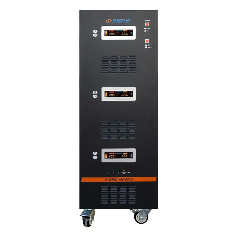 Принцип работы стабилизаторов серии Hybrid II поколения – комбинированный (электромеханический и релейный). Трехфазные стабилизаторы Hybrid отличаются высокой точностью, поскольку плавная регулировка позволяет добиться минимальных отклонений выходного напряжения от эталонного, а установленные реле обеспечивают высокую скорость регулировки и расширяют рабочий диапазон входного напряжения.