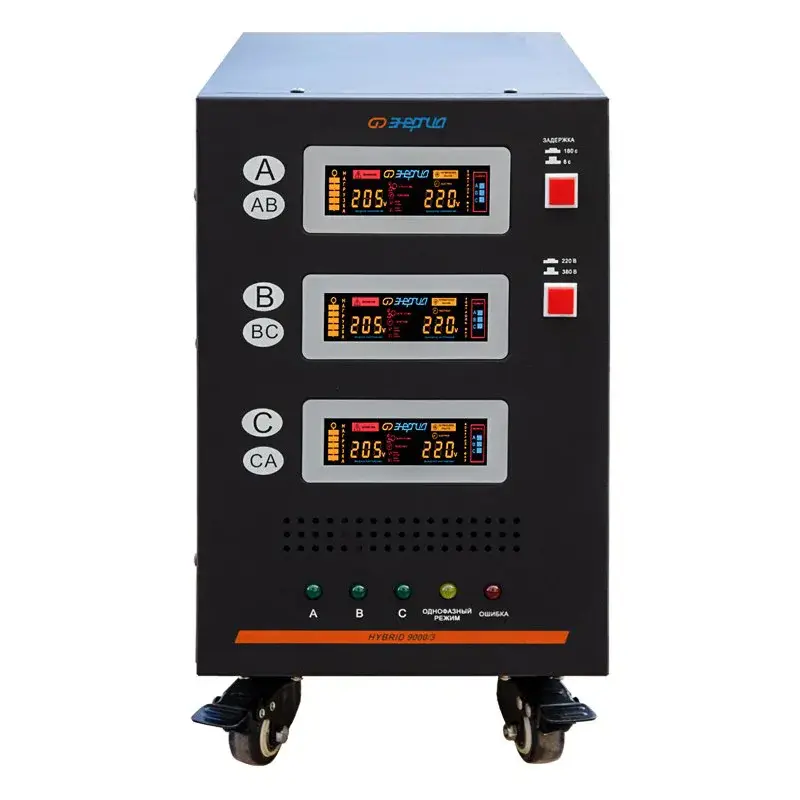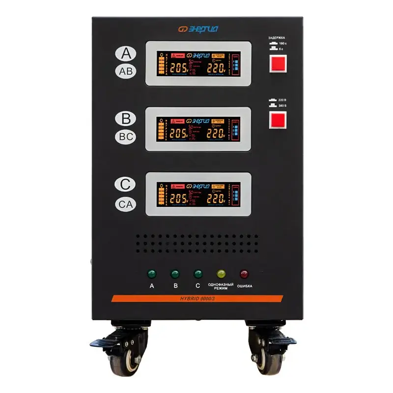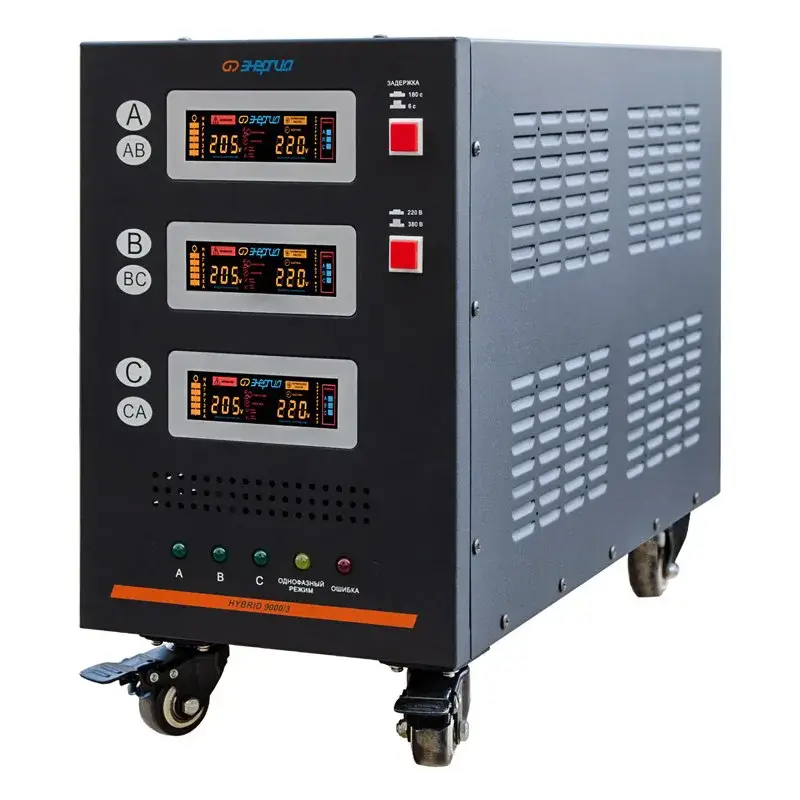 Принцип работы стабилизаторов серии Hybrid II поколения – комбинированный (электромеханический и релейный). Трехфазные стабилизаторы Hybrid отличаются высокой точностью, поскольку плавная регулировка позволяет добиться минимальных отклонений выходного напряжения от эталонного, а установленные реле обеспечивают высокую скорость регулировки и расширяют рабочий диапазон входного напряжения.