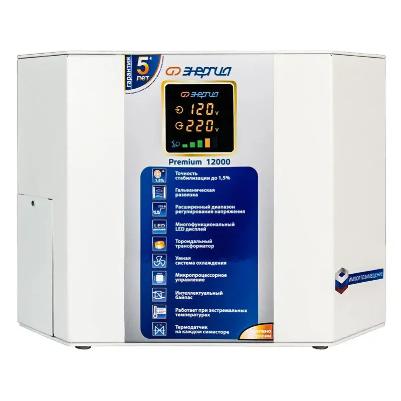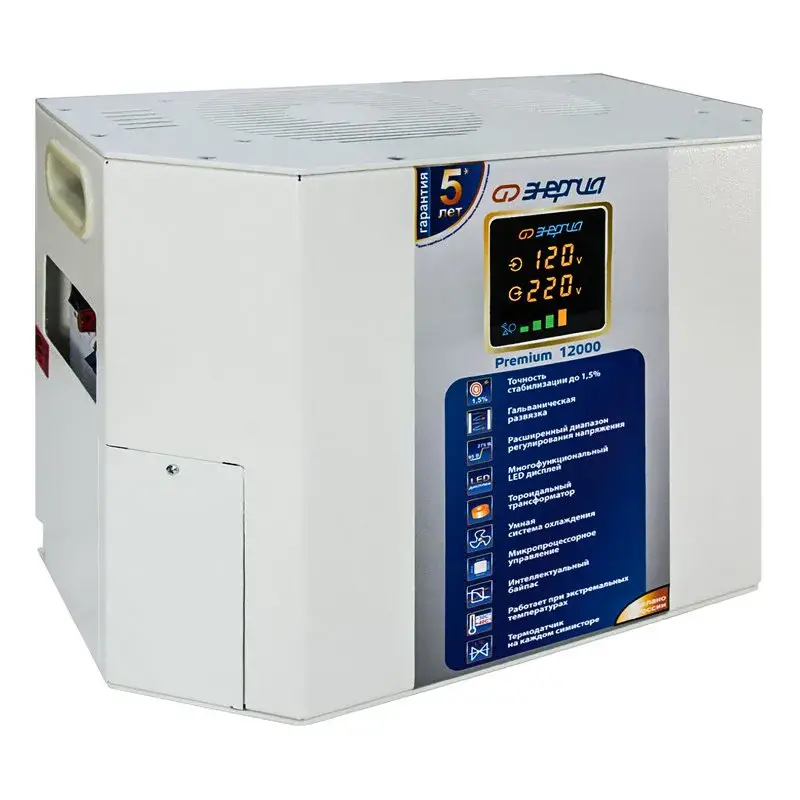 Симисторный Стабилизатор напряжения Энергия Premium предназначен для обеспечения стабильным электропитанием потребителей. Это самый точный стабилизатор в ассортименте компании Энергия. Точность достигается за счёт 49 ступеней регулирования. Симисторные ключи обладают высокой надежностью и большим рабочим ресурсом.