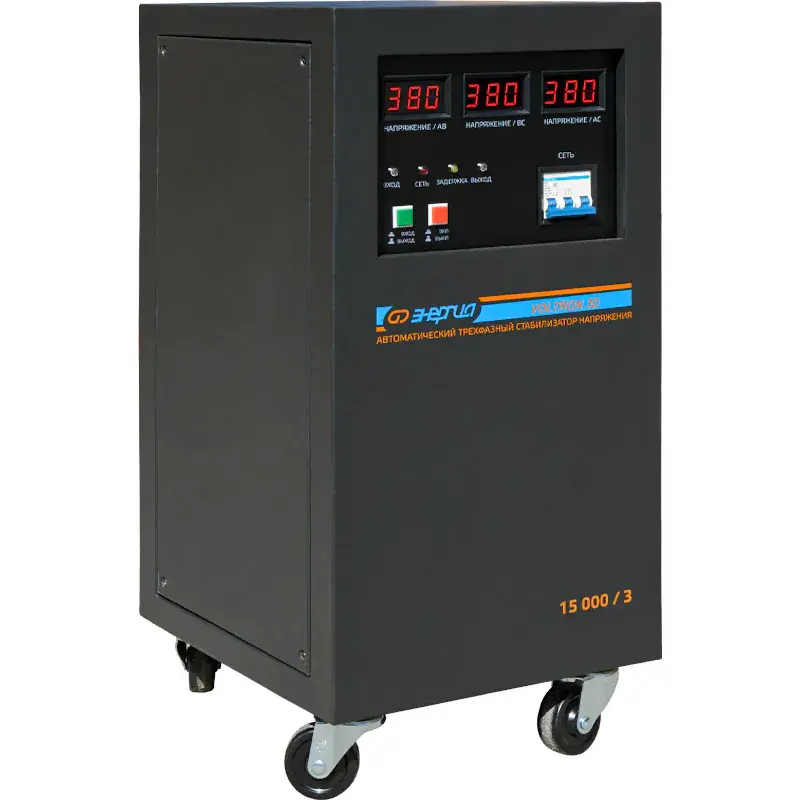 Трехфазный стабилизатор напряжения ЭНЕРГИЯ Voltron 3D 15000/3 обеспечивает подключенное оборудование качественной электроэнергией со стабильными уровнями фазного и линейного напряжения. Максимальная полная мощность нагрузки в длительном режиме составляет 15000 ВА. Благодаря электронной системе управления КПД устройства достигает 98 %. Допускается эксплуатация в температурном диапазоне от -5 до +40_С.