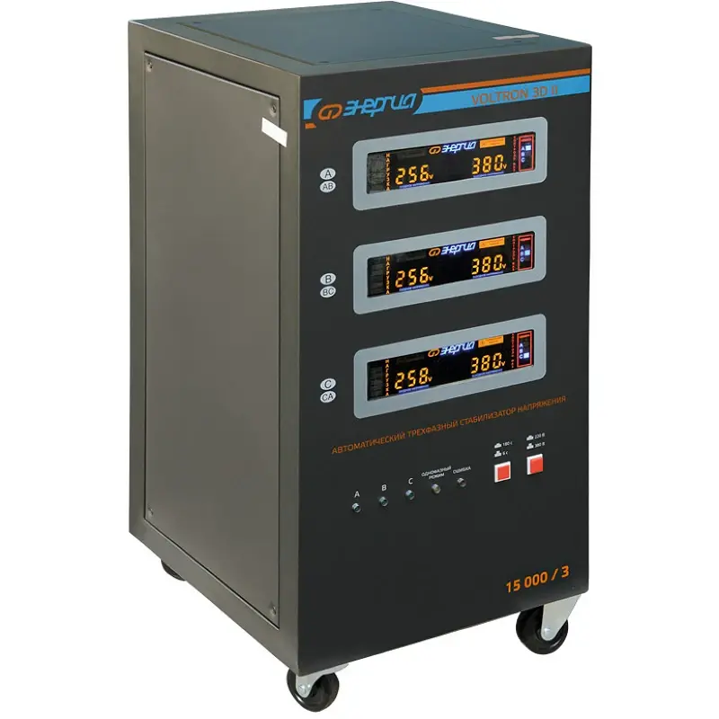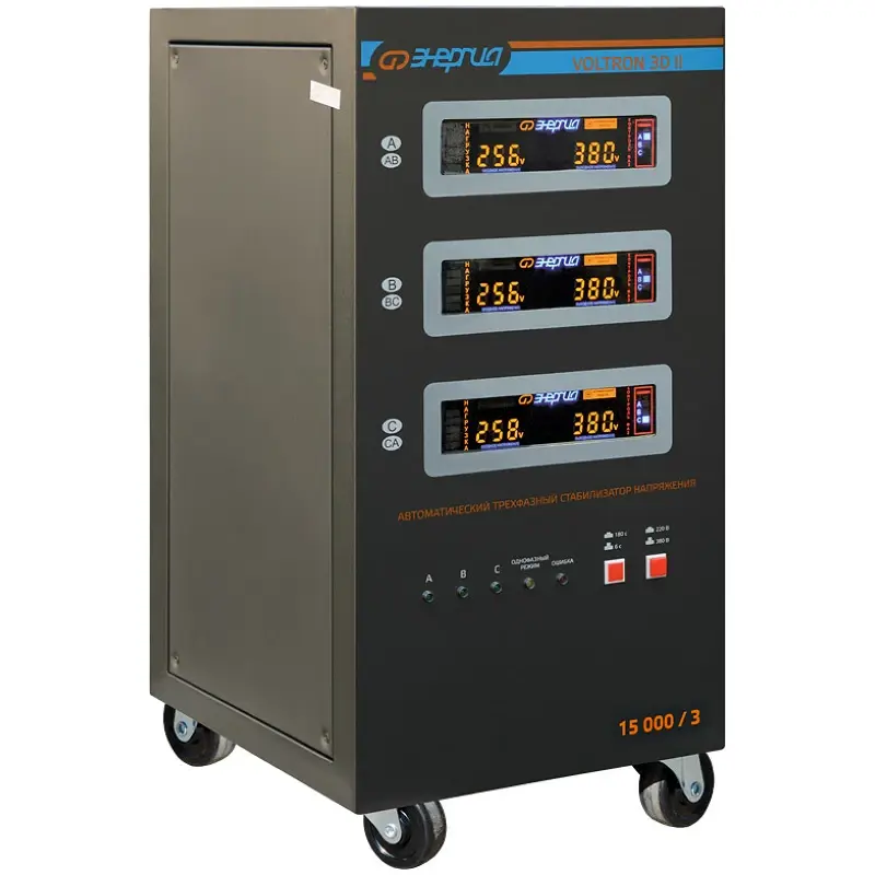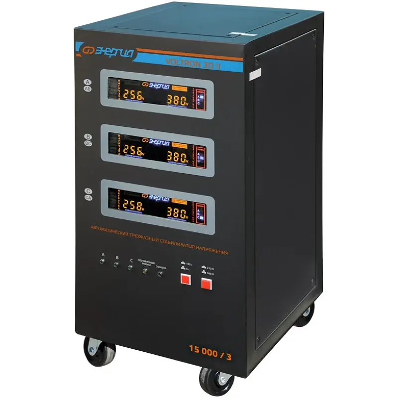 В обновлённой линейке трёхфазных стабилизаторов напряжения Энергия VOLTRON 3D II возможен выбор работы стабилизатора либо в трёхфазном режиме работы (для 3–фазных потребителей), либо в 1-фазном режиме работы.