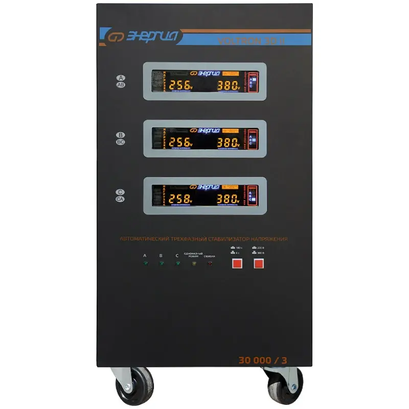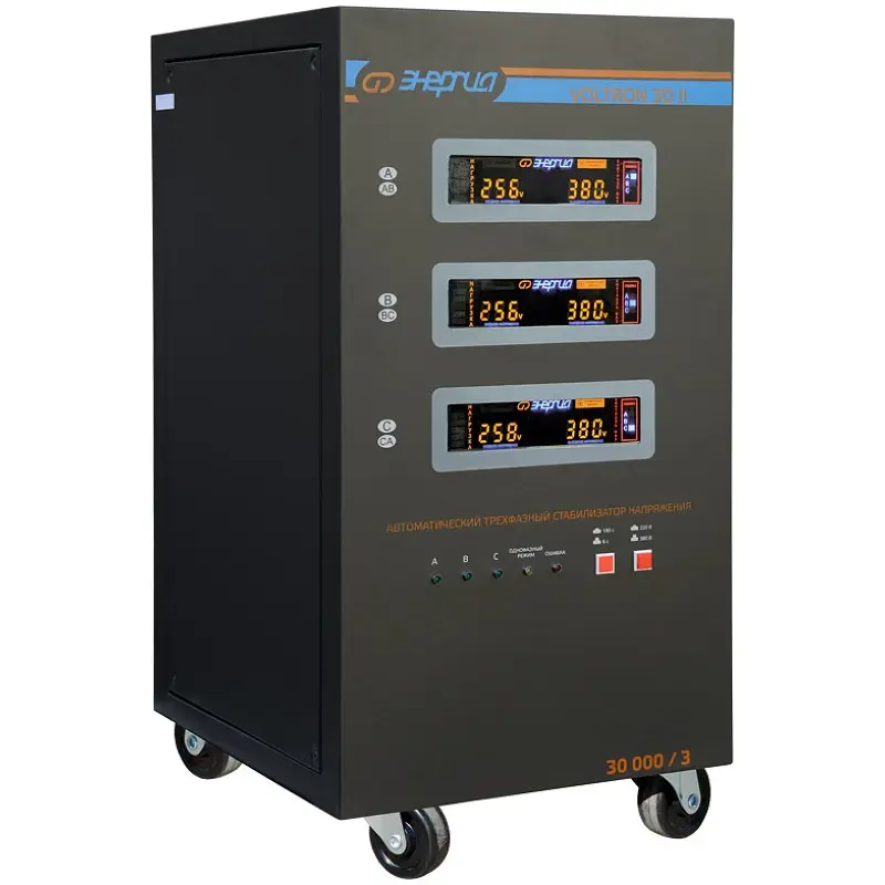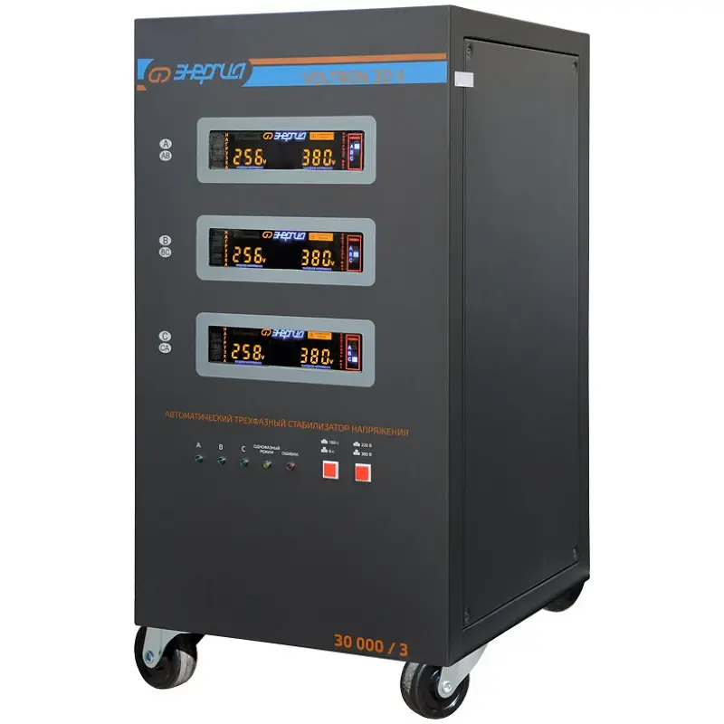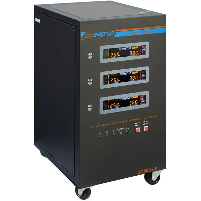 В обновлённой линейке трёхфазных стабилизаторов напряжения Энергия VOLTRON 3D II возможен выбор работы стабилизатора либо в трёхфазном режиме работы (для 3–фазных потребителей), либо в 1-фазном режиме работы.