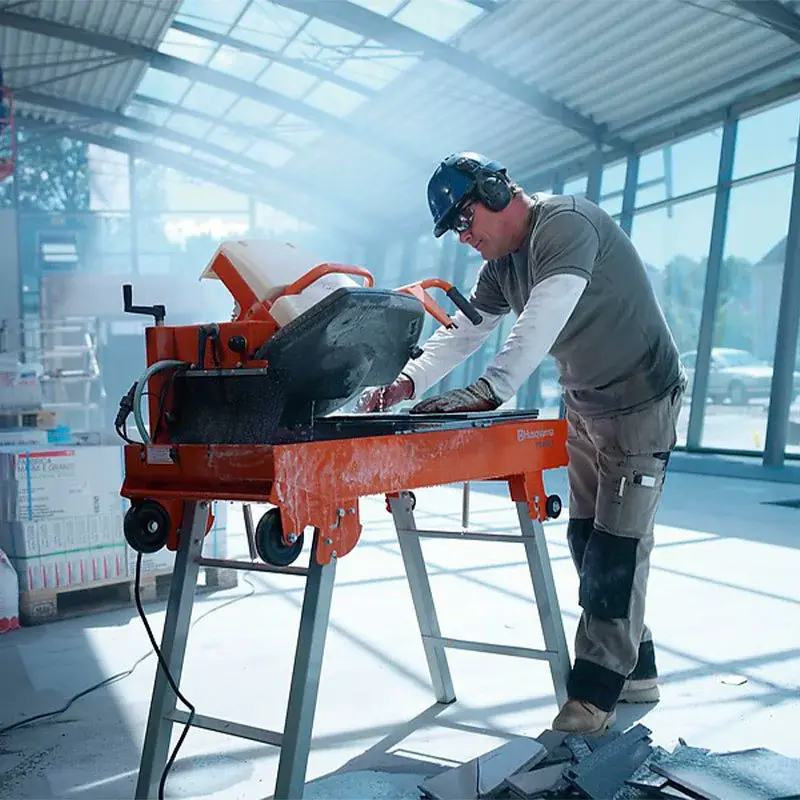 Камнерезная пила Husqvarna TS 400 F с водяным охлаждением предназначена для резки кирпича, бетона, камня, плит из керамики, гранита, мрамора. Вода поступает из 40-литровой емкости на диск через встроенный насос. Станок имеет механизм наклона режущей оснастки для пиления под углом до 45_. Камнерез оснащен диском диаметром 400 мм с посадочным отверстием под шпиндель 25,4 мм. Пила работает от асинхронного двигателя мощностью 2200 Вт и получает питание от сети с напряжением 230 В.