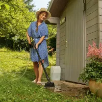 Устройство распыляет воду под высоким давлением, что позволяет эффективно счищать пыль и грязь с различных поверхностей без дополнительных физических воздействий. В комплект входят две базовых насадки: веерная и роторная. Установите первую, если требуется бережная очистка хрупких поверхностей: садовой мебели, ковров, игрушек. Вторая подойдет для создания мощной струи, которая удалит стойкие загрязнения с садового инвентаря и техники.