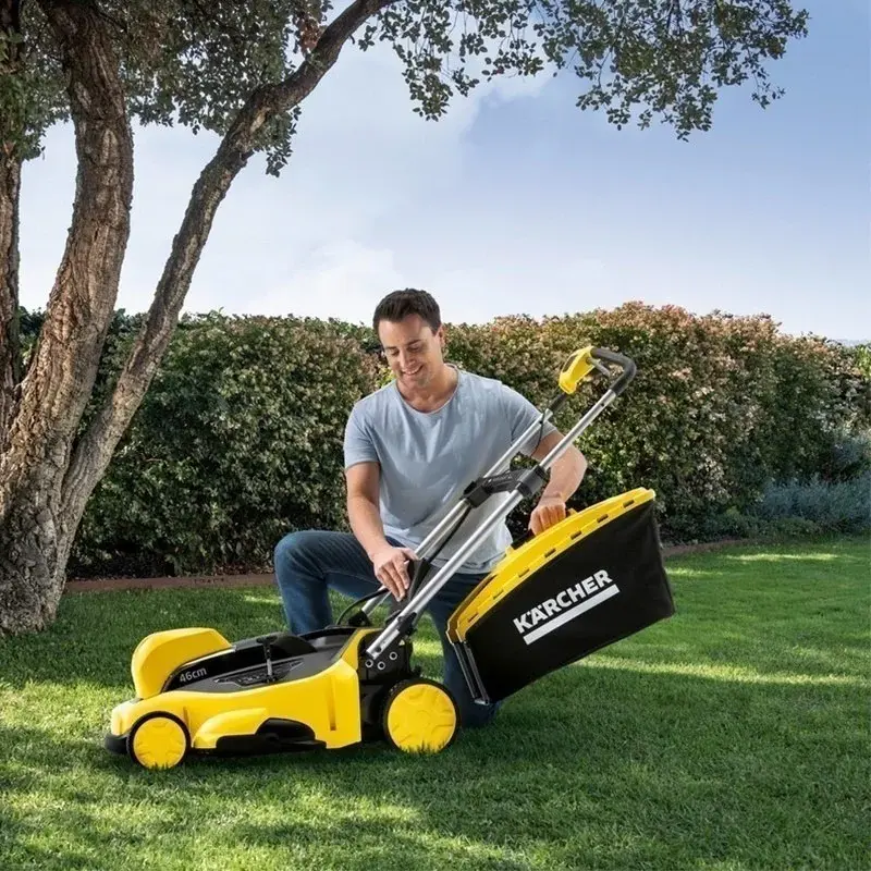 Аккумуляторная газонокосилка Karcher LMO 36-46 Battery с максимальной скоростью движения 3 км/ч обладает регулировкой высоты реза и приводом на задние колеса. Ширина обработки составляет 46 см. Оснащена функцией мульчирования. В комплекте поставляется травосборник, указатель уровня его заполнения и ручка для переноски.