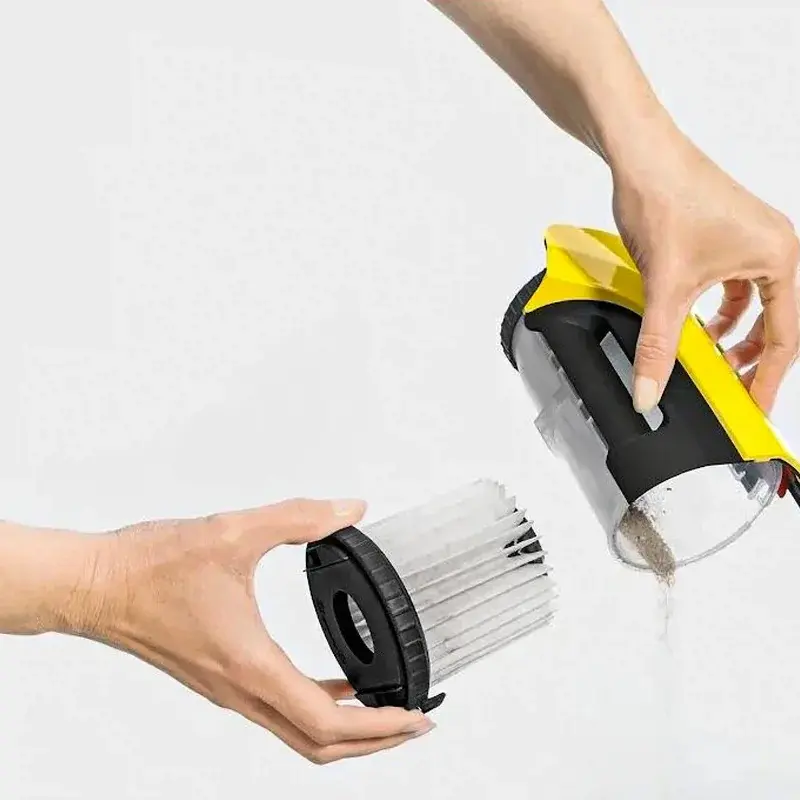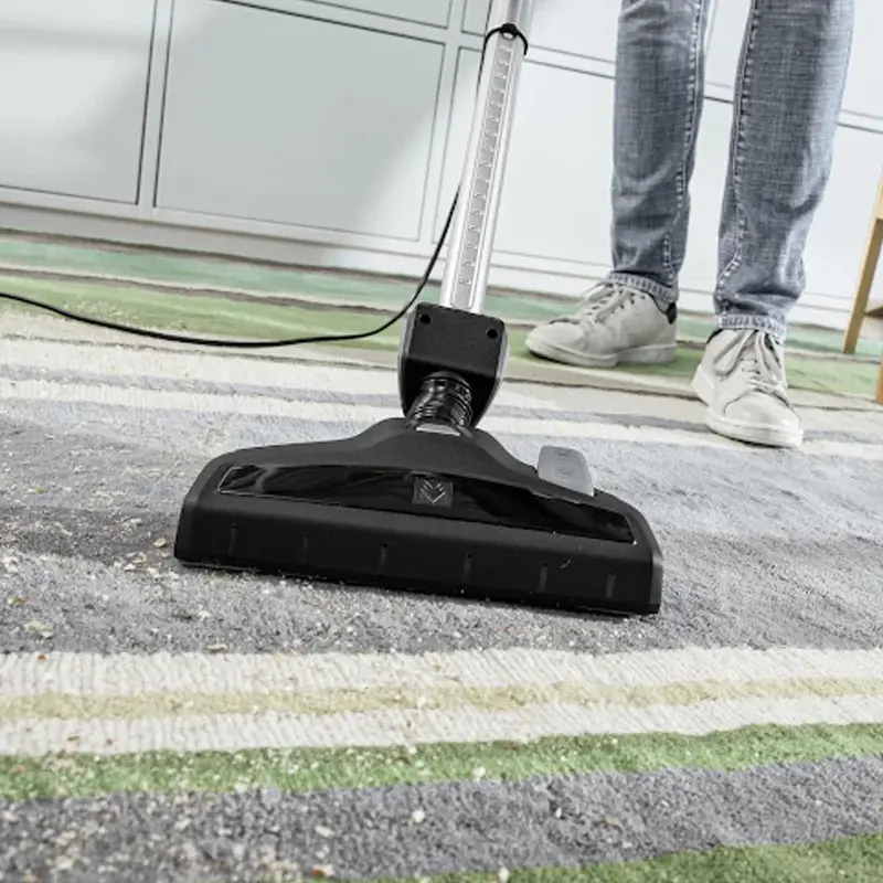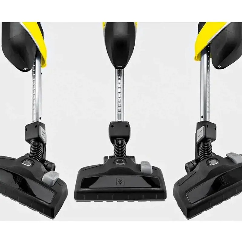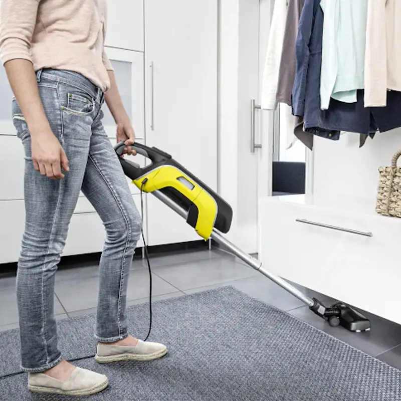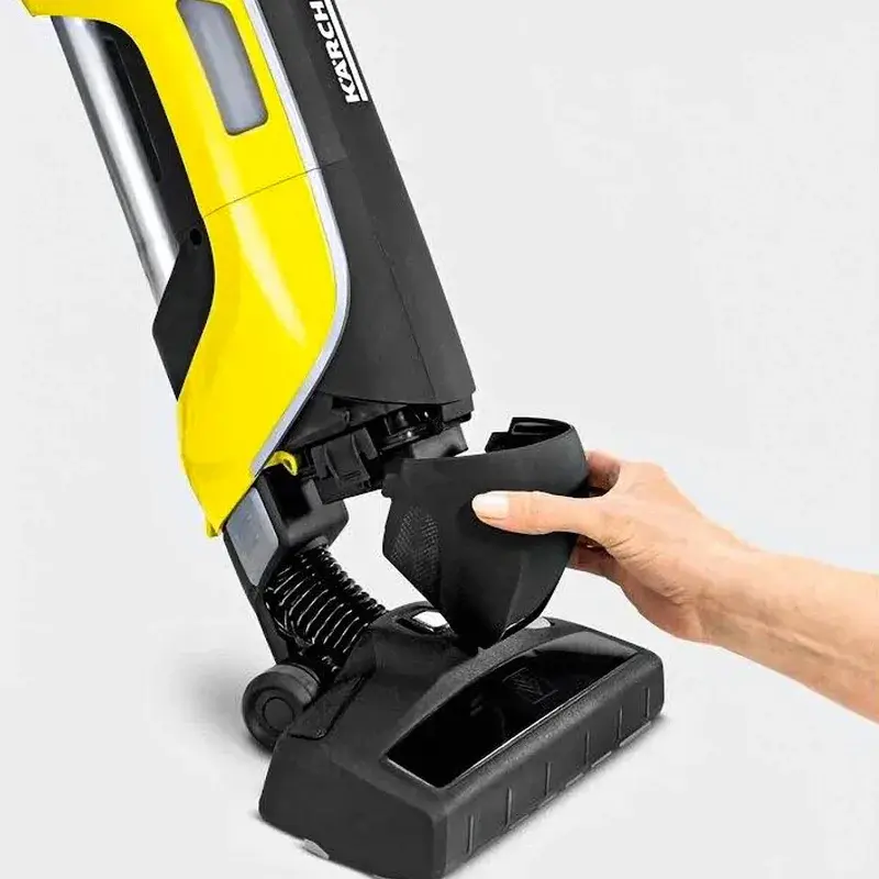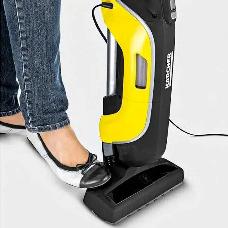 Пылесос Karcher VC 5 предназначен для сухой уборки дома. Он с легкостью справится с чисткой любых напольных покрытий, ковров и мягкой мебели. А также со сбором пыли, например с полок и других труднодоступных мест. Длинный сетевой кабель из комплекта поставки позволяет убираться в радиусе 8 метров, поэтому с помощью пылесоса Керхер можно убирать комнату за комнатой, не выключая прибор из розетки, или использовать его для помещений с достаточной большой площадью. Особенности вертикального пылесоса Регулировка мощности. Инновационная складывающаяся всасывающая трубка. Щетка с подвижным соединением. Подключение сменных насадок. Преимущества VC 5 Четырехступенчатая регулировка мощности позволяет подбирать нужные настройки в соответствии с выполняемой задачей. А быстро переключать мощность всасывания вы сможете с помощью кнопки, которая вынесена на рабочую рукоятку. Телескопическая всасывающая трубка состоит из 3-х частей. Одним нажатием кнопки вы можете увеличить ее длину, подбирая высоту ручки под свой рост для удобной работы. Складывается трубка так же просто. При сложенной ручке вертикальный пылесос уменьшается вдвое и занимает минимум места при хранении. Подвижность головки щетки обеспечивается за счет гибкого соединения. Это повышает ее маневренность при работе, позволяя собирать мусор вдоль стен, в углах, между мебелью и рядом с предметами интерьера, не передвигая их. Щетка плотно прилегает к вертикальным поверхностям, обеспечивая тщательную уборку без лишних движений даже в труднодоступных местах. Благодаря возможности подключения других аксессуаров, пылесос сухой уборки может использоваться для выполнения разноплановых задач. Его область применения не ограничивается чисткой напольных покрытий. Сменные насадки позволяют эффективно очищать мягкую мебель, матрацы, полки и иные вертикальные и горизонтальные поверхности.