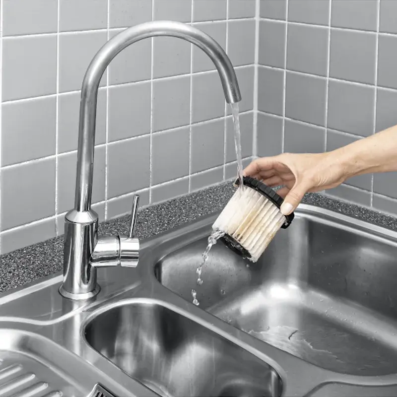 Подвижность головки щетки обеспечивается за счет гибкого соединения. Это повышает ее маневренность при работе, позволяя собирать мусор вдоль стен, в углах, между мебелью и рядом с предметами интерьера, не передвигая их. Щетка плотно прилегает к вертикальным поверхностям, обеспечивая тщательную уборку без лишних движений даже в труднодоступных местах.
