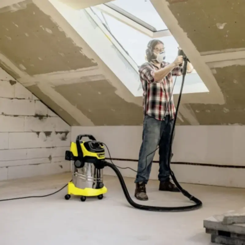 Этот хозяйственный пылесос, обладающий колоссальной силой всасывания при низком энергопотреблении (всего 1300 Вт), поставляется с насадкой-пылеулолвителем, позволяющей высверливать отверстия без распространения пыли. Аппарат WD 6 P S V-30/6/22/T + DDC имеет 6-метровый кабель, всасывающий шланг длиной 2,2 м и 30-литровый мусоросборник из нержавеющей стали с запираемым пробкой отверстием для удобного слива жидкостей.