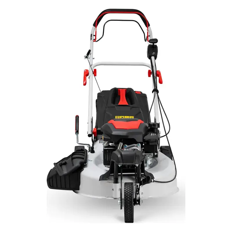Бензиновая газонокосилка поддерживает несколько режимов работы. Скошенная трава либо собирается в травосборник, либо выбрасывается обратно на газон через боковой или задний разгрузочный лоток, либо мульчируется для удобрения почвы. Семиуровневая регулировка высоты кошения выполняется при помощи рычага около заднего колеса. Косилка движется самостоятельно с постоянной скоростью. Достаточно лишь задать направление. В труднопроходимых местах привод можно отключить, отпустив соответствующий прижимной рычаг. На рукоятке предусмотрен специальный держатель для шнура стартера, избавляющий от необходимости наклоняться вперед при запуске двигателя.