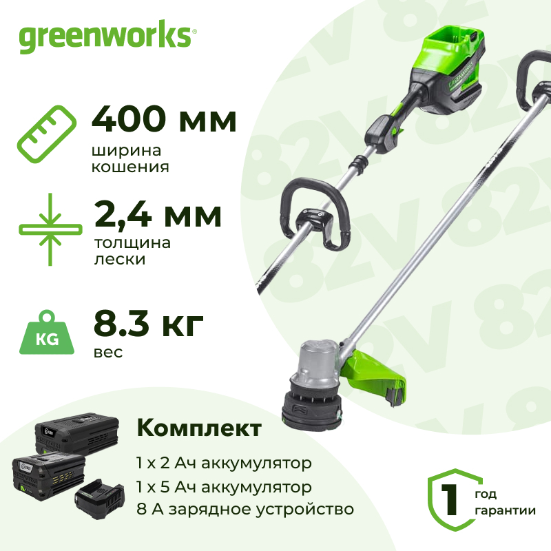 Триммер аккумуляторный Greenworks GD82LT отлично подойдет для ведения дачного хозяйства, покоса обширных площадей коммунальными организациями. Леска 2,4 мм с ударной подачей из катушки с легкостью справится с высокой и густой травой.