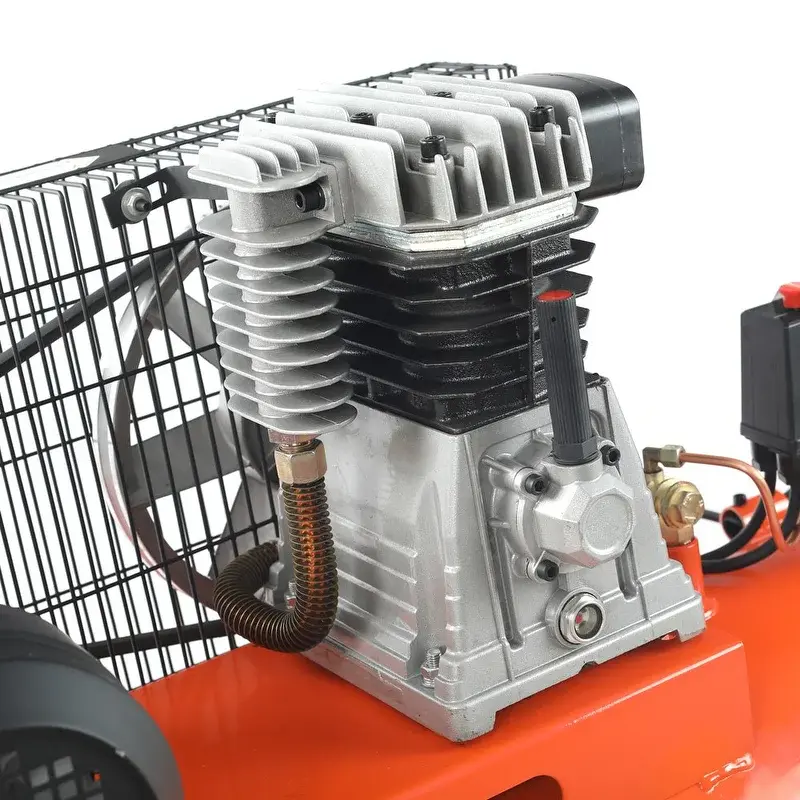 Масляный компрессор питается от сети переменного тока с напряжением 230 В. Модель с одноступенчатой двухцилиндровой поршневой группой оснащена электродвигателем мощностью 2,2 кВт, который стабильно поддерживает 1050 об/мин. Ременная передача обеспечивает плавный старт и мягкую работу, повышает КПД, увеличивает период эксплуатации и максимальное выходное давление. Передаточное колесо в виде крыльчатки помимо своих основных функций охлаждает поршневую группу. На поверхности воздухопровода предусмотрено оребрение для улучшения теплоотдачи.