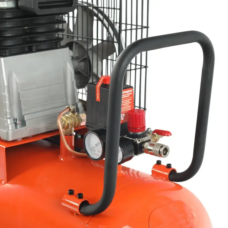Решетчатое ограждение защищает ременный привод от повреждений, а вас от случайных травм. Колеса и рукоятка позволяют перекатывать пневмокомпрессор. Переднее поворотное колесо снабжено стопорным механизмом для устойчивости. Амортизаторы снижают вибрацию во время работы.