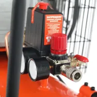 После запуска двигателя прессостат автоматически поддерживает работу компрессора, включая и отключая нагнетание воздуха. Два манометра позволяют контролировать давление в ресивере и на выходе. Давление на выходе можно изменить с помощью поворотного регулятора.