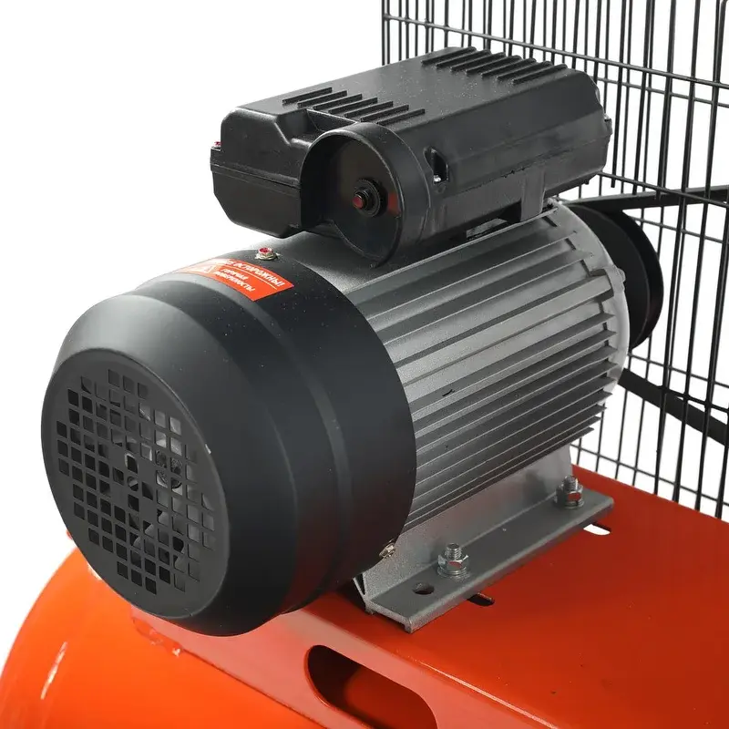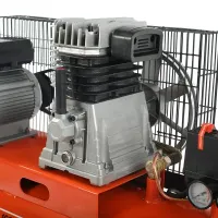 Масляный компрессор питается от сети переменного тока с напряжением 230 В. Модель с одноступенчатой двухцилиндровой поршневой группой оснащена электродвигателем мощностью 2,2 кВт, который стабильно поддерживает 1050 об/мин. Ременная передача обеспечивает плавный старт и мягкую работу, повышает КПД, увеличивает период эксплуатации и максимальное выходное давление. Передаточное колесо в виде крыльчатки помимо своих основных функций охлаждает поршневую группу. На поверхности воздухопровода предусмотрено оребрение для улучшения теплоотдачи.