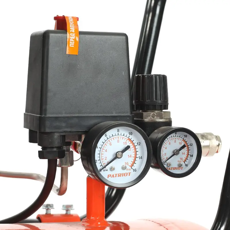 После запуска двигателя работу компрессора автоматически поддерживает прессостат, включая и отключая подкачку воздуха. Во избежание аварийных ситуаций при отказе реле давления воздух стравливается через предохранительный клапан. Два манометра позволяют контролировать давление в ресивере и на выходе. Давление на выходе можно изменить поворотным регулятором.