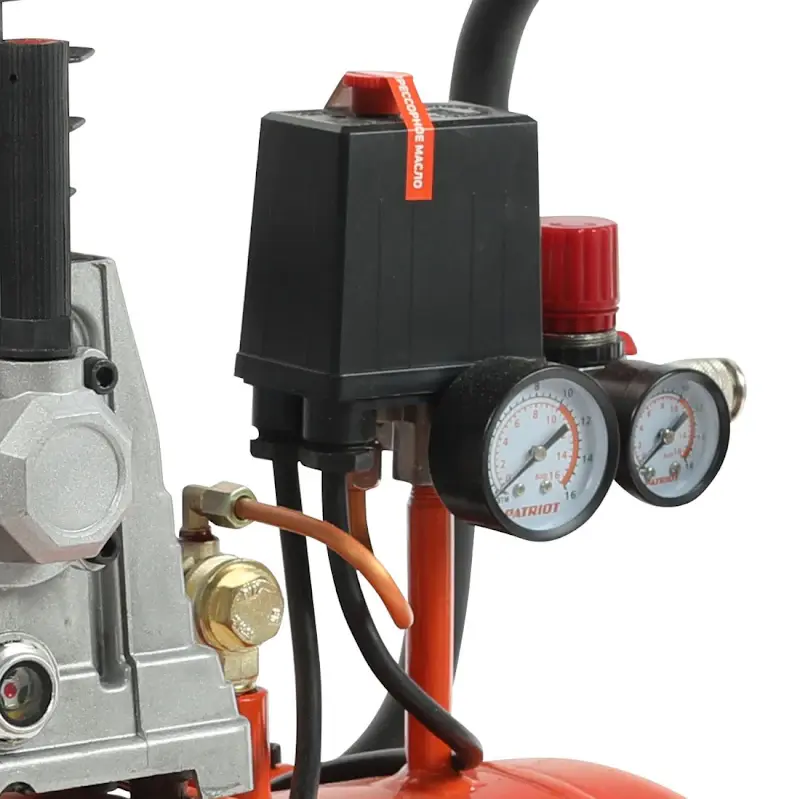 После запуска двигателя реле давления автоматически поддерживает работу компрессора, включая и отключая подкачку воздуха. Во избежание аварийных ситуаций при отказе прессостата воздух стравливается через предохранительный клапан. Контролировать давление в ресивере и на выходе удобно с помощью двух манометров. Давление на выходе можно менять с помощью поворотного регулятора.
