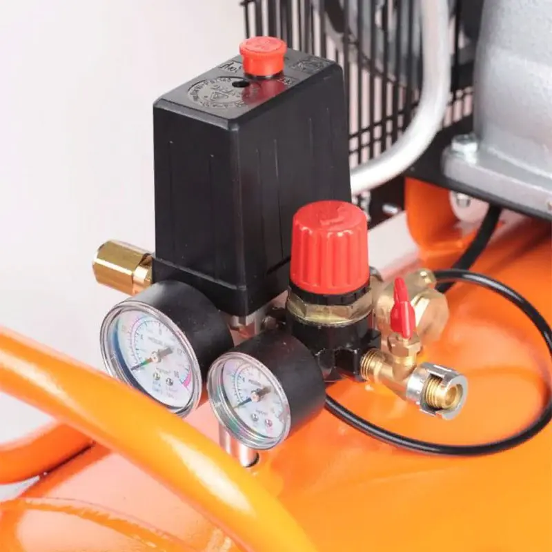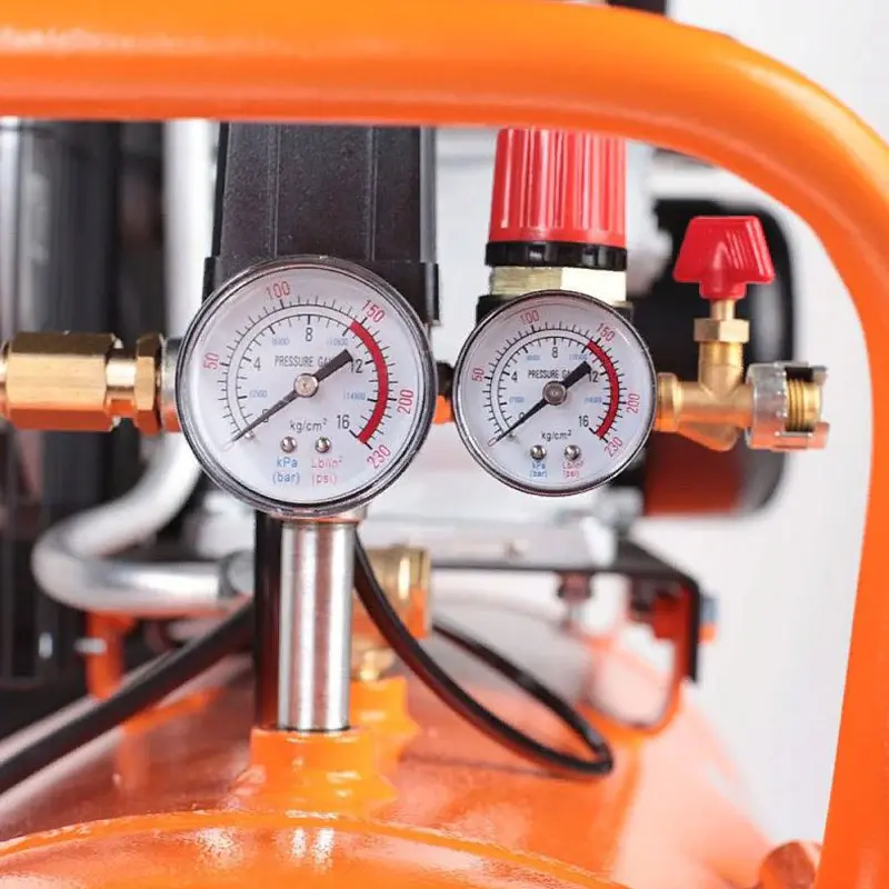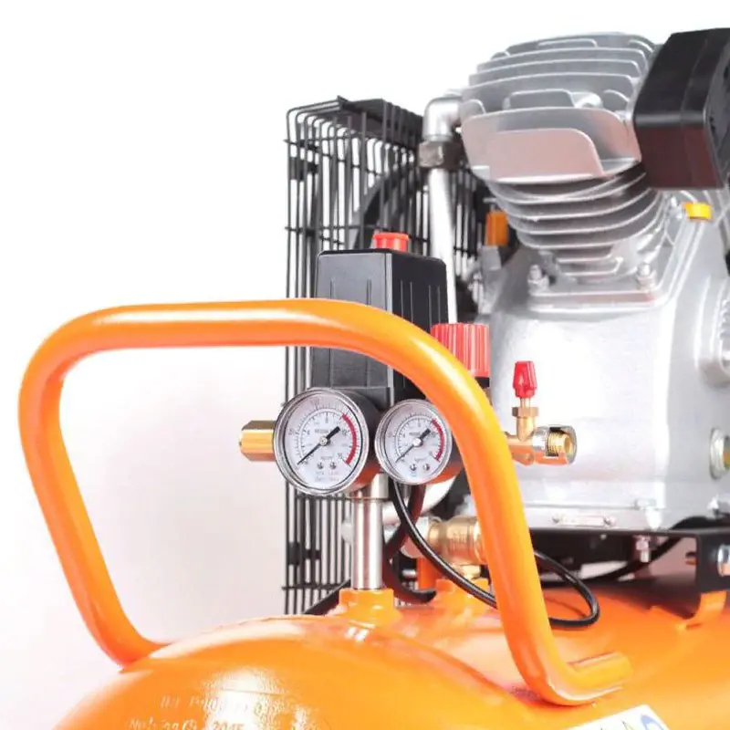 Прессостат выключает электродвигатель при достижении максимального давления в ресивере и автоматически запускает его, когда в результате отбора сжатого воздуха давление падает ниже предустановленного уровня. С помощью регулятора вы можете уменьшить давление до требуемого рабочего в подсоединенном пневмоинструменте. Два механических манометра позволяют контролировать давление в ресивере и на выходе.