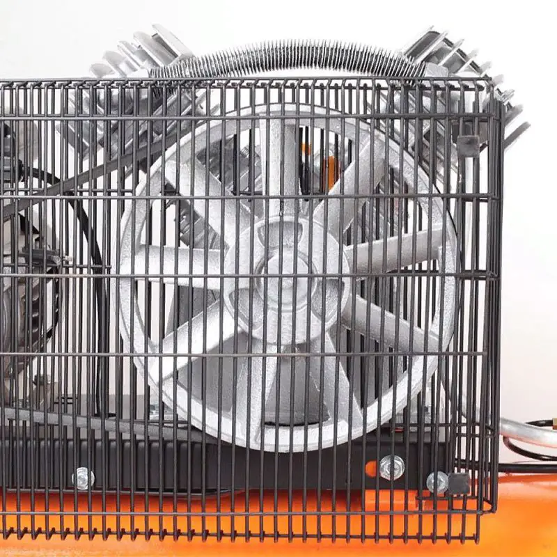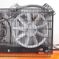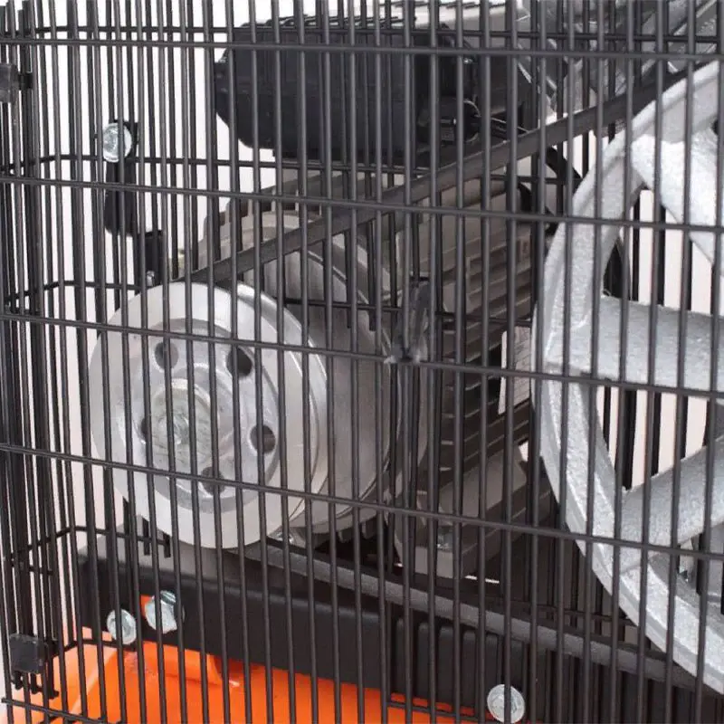 Масляный компрессор оснащен V-образной двухцилиндровой поршневой группой, которая приводится в действие электродвигателем мощностью 2,2 кВт через ременную передачу. Ремень оказывает демпфирующее действие, делает более плавным старт и мягкой работу, обеспечивает высокий КПД и выходное давление. Передаточное колесо выполнено в виде крыльчатки для дополнительного охлаждения поршневой группы. На поверхности головок цилиндров и воздухопровода предусмотрены ребра для улучшения теплоотдачи.