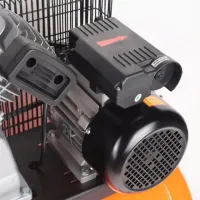 В донной части ресивера объемом 100 л предусмотрен конденсатоотводчик. В электродвигателе установлено устройство защиты от перегрузок. Металлическое ограждение защищает ременной привод от повреждений. Колесная база и рукоятка облегчают перемещение пневмокомпрессора. Амортизаторы гасят вибрацию во время работы компрессора.