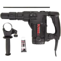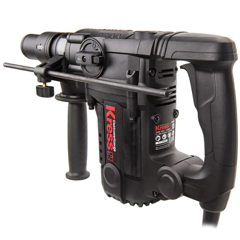 Сетевой перфоратор Kress снабжен переключателем рабочих режимов: долбление и ударное сверление. Скорость оборотов регулируется силой нажатия на выключатель. Дополнительную рукоятку можно установить с любой стороны. Прорезиненная накладка обеспечивает надежное удержание инструмента. Ограничитель глубины сверления позволяет выполнять глухие отверстия.