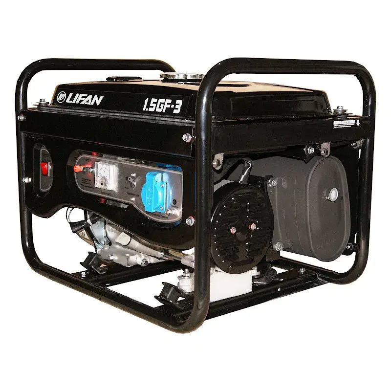 Бензогенератор Lifan 1500 – бытовая модель для питания строительного инструмента или домашней техники максимальной мощностью 1,5 кВт. Аппарат экономно потребляет горючее и оснащен вместительным топливным баком. На панели управления размещены клеммы 12 В для зарядки автомобильного аккумулятора.