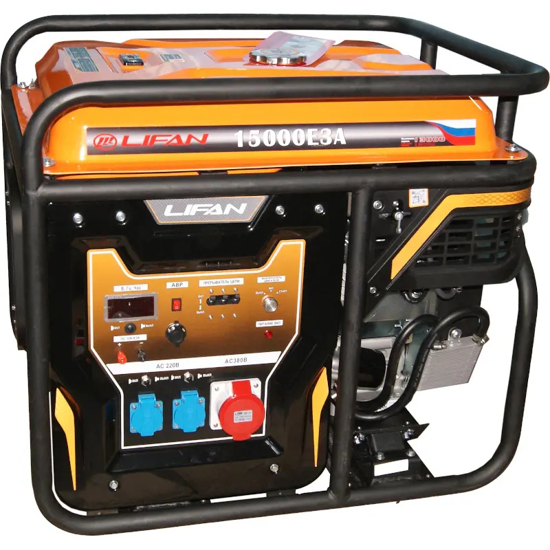 LIFAN 15000E3A - мощный трехфазный бензиновый генератор, применяемый в качестве источника электроэнергии на дорожных и строительных работах, промышленных объектах, на личных загородных участках, в автомастерских, магазинах и в других подобных областях. Исключительная надежность, устойчивость к поломкам и высочайшая производительность делают данную модель одной из лучших на рынке в своем классе электрогенераторов.