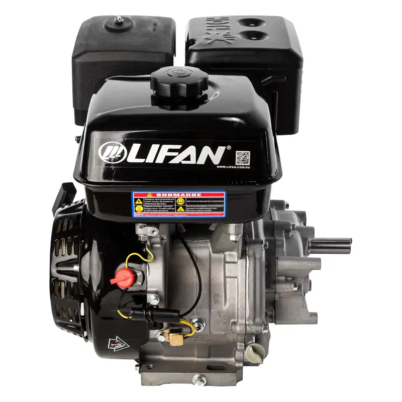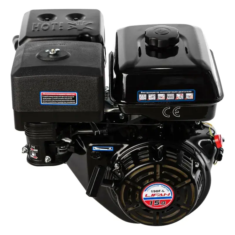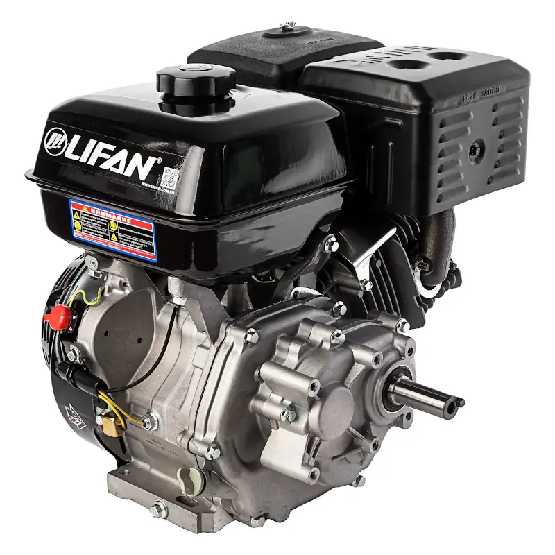 Бензиновый двигатель Lifan 190 F- L разработан для установки на мототехнику различного уровня. Двигатель хорошо подходит для установки на культиваторы и мотоблоки, мотобуксировщики, мотопомпы, генераторы и другую технику. Эта модель сочетает в себе долговечность, экономичность с умеренной стоимостью и простотой в использовании. Наличие понижающего редуктора позволяет расширить область применения двигателя. Это четырехтактный одноцилиндровый двигатель внутреннего сгорания. Рабочий объем цилиндра составляет 420 кубических сантиметров. Диаметр цилиндра и тип газораспределительного механизма позволяют обеспечить компактные размеры двигателя, он свободно устанавливается на многие модели малой сельскохозяйственной техники. В качестве топлива эта модель использует широко распространенный автомобильный бензин марки АИ-92, потому проблем с горючим не возникнет. Коленчатый вал имеет горизонтальное расположение, это также способствует небольшим размерам, а кроме того существенно упрощает конструкцию и монтаж силового агрегата на шасси. Крутящий момент достигает 25 Н.м при 3600 оборотов в минуту, при этом сохраняется высокая стабильность работы и небольшой расход бензина. Емкость топливного бачка равна 6,5 литрам, одной заправки достаточно для длительной непрерывной работы. В качестве смазки используется доступное и известное каждому автомобилисту моторное масло 10х30, 10х40 для одной заправки маслом требуется не более 1,1 литра. Транзисторная система зажигания проста в обслуживании и долговечна, она способствует стабильной работе двигателя при любых условиях. Двигатель Lifan 190 F-L обладает массой в 36 килограмм, это легковесный и компактный агрегат, он способен обеспечить высокую продуктивность работы при минимальных затратах и потерях. Его простая конструкция не создаст проблем при установке или при обслуживании, использование эффективного воздушного охлаждения позволяет активно использовать мотор даже в жаркую погоду, удобный пусковой тросик обеспечивает легкий запуск двигателя.