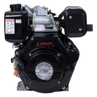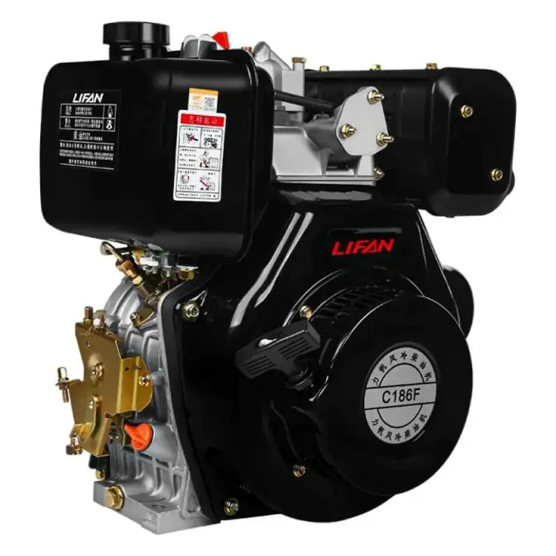 Дизельный двигатель Lifan 186 F разработан для установки на мототехнику различного уровня. Двигатель хорошо подходит для установки на мотобуксировщики (мотособаки), снегоходы, болотоходы, вездеходы, картинги, лодочные моторы, мотопомпы, генераторы и другую всевозможную технику. Эта модель сочетает в себе долговечность, экономичность с умеренной стоимостью и простотой в использовании. Это четырехтактный одноцилиндровый дизельный двигатель с воздушным охлаждением. Рабочий объем цилиндра составляет 418 кубических сантиметров, номинальная мощность достигает 8,9 лошадиных сил, а максимальная может достигать 10 лошадиных сил. Диаметр цилиндра и тип газораспределительного механизма позволяют обеспечить компактные размеры двигателя, он свободно устанавливается на многие модели малой сельскохозяйственной техники. В качестве топлива эта модель использует широко распространенное дизельное топливо, потому проблем с горючим не возникнет. Коленчатый вал имеет горизонтальное расположение, это также способствует небольшим размерам, а кроме того существенно упрощает конструкцию и монтаж силового агрегата на шасси. Крутящий момент достигает 18,7 Н.м при 2880 оборотов в минуту, при этом сохраняется высокая стабильность работы и небольшой расход топлива. Емкость топливного бачка равна 5,5 литрам, одной заправки достаточно для длительной непрерывной работы. В качестве смазки используется доступное и известное каждому автомобилисту моторное масло 10х30, 10х40 для одной заправки маслом требуется не более 1,65 литра.