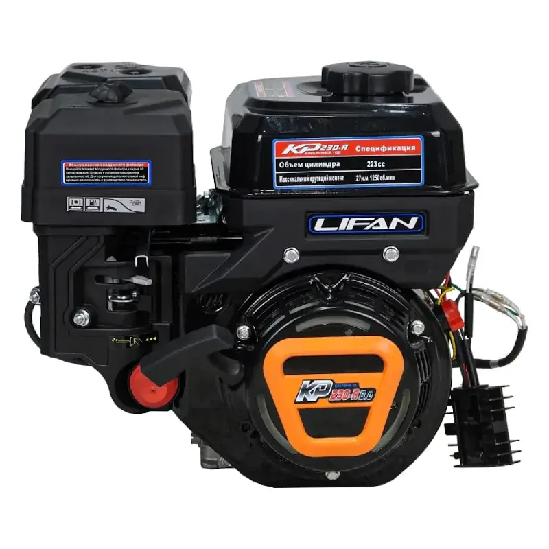 Бензиновый двигатель Lifan KP230-R D20 7А специально разработан для установки на мотоблоки, культиваторы, снегоочистители, генераторы и другую маломощную технику. Одноцилиндровый 4-тактный двигатель мощностью 8 л.с. работает на бензине АИ-92 и заводится с помощью надежного ручного стартера, имеющего износостойкий трос. Благодаря увеличенному объему цилиндра крутящий момент достигает 13,5 Нм при 2500 об/мин. Расход топлива не превышает 370 г/кВт*ч. Большой топливный бак емкостью 3,6 л обеспечивает продолжительную работу на одной заправке. На мотор установлен понижающий редуктор с автоматическим сцеплением.