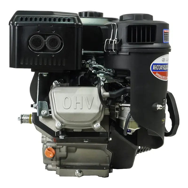 Данный двигатель имеет горизонтальный вал, воздушное охлаждение и ручной старт. На двигателе установлен глушитель и воздушный фильтр "зима-лето". Фильтры "зима-лето" имеют три режима работы, а их главное отличие в способе забора воздуха.
